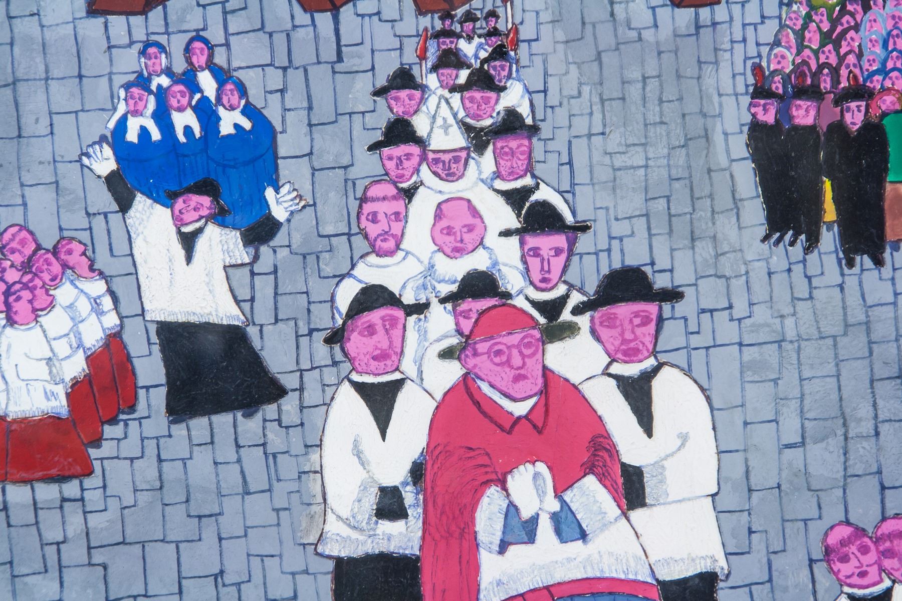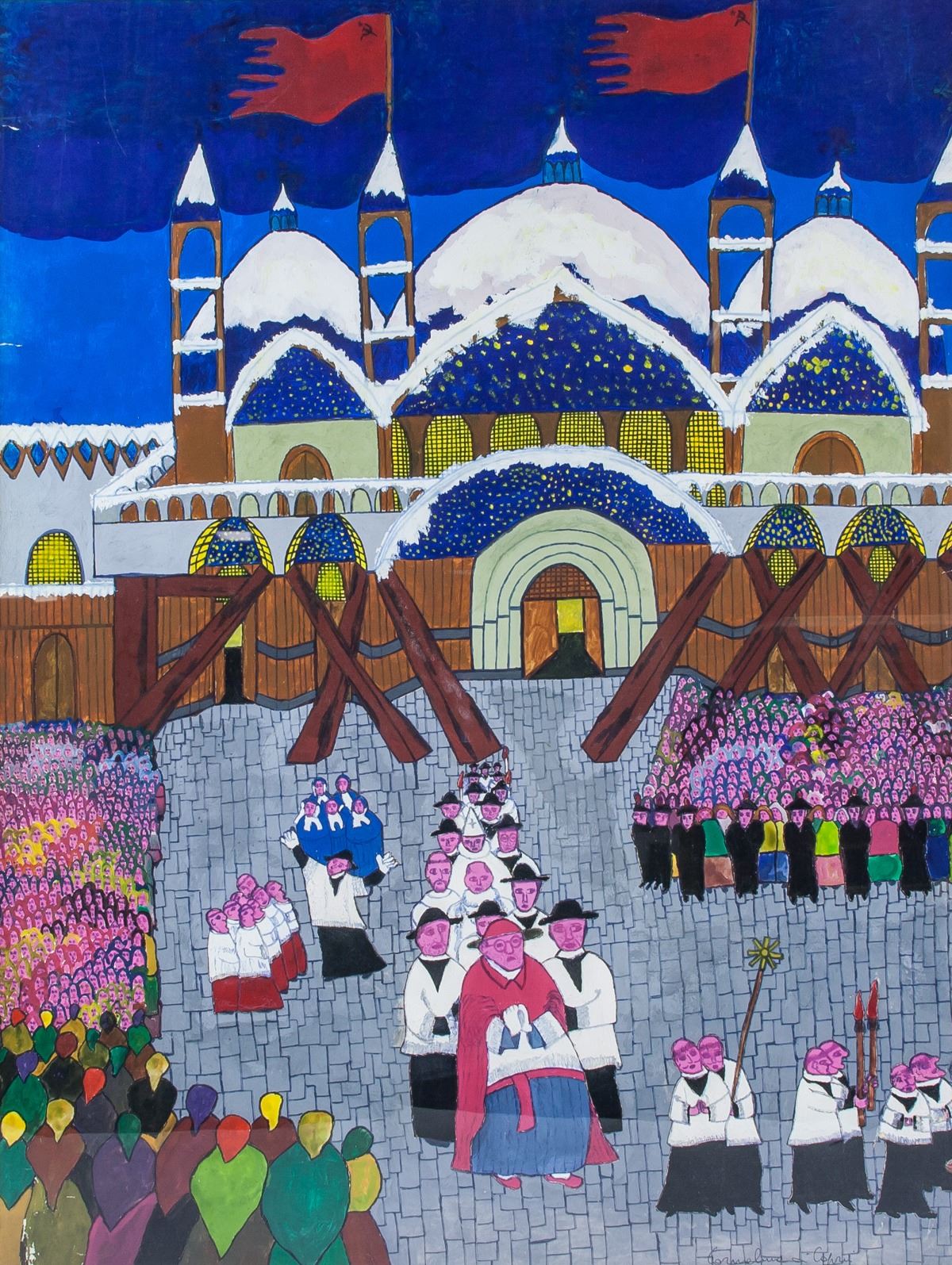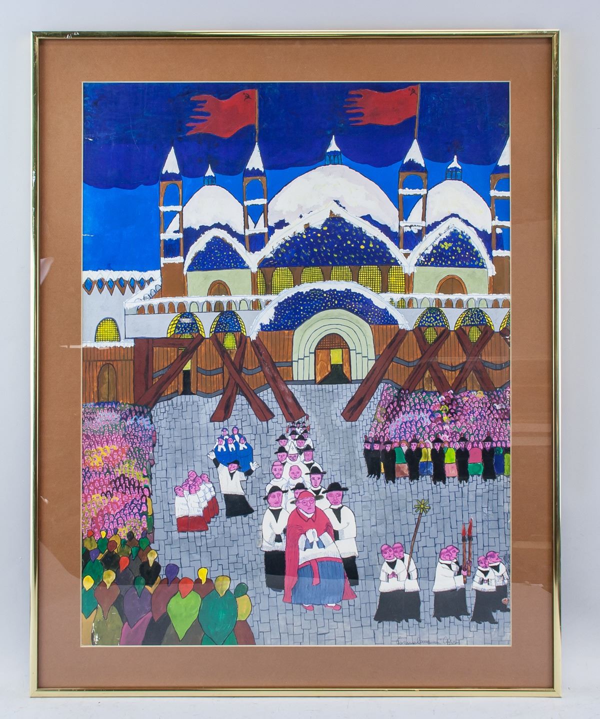 Oil on paper, framed. Featuring a Catholic ceremony scene. Signed Carmelina de Capri (1920-2004, Italian) on the lower right corner. 63.5 x 48 cm (25 x 19 inches) Frame size: 74.5 x 59 cm (30 x 23 inches). PROVENANCE: Southern Ontario estate.