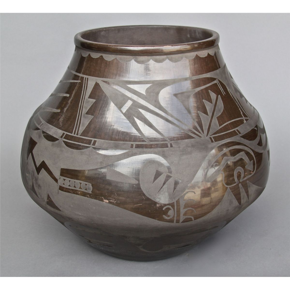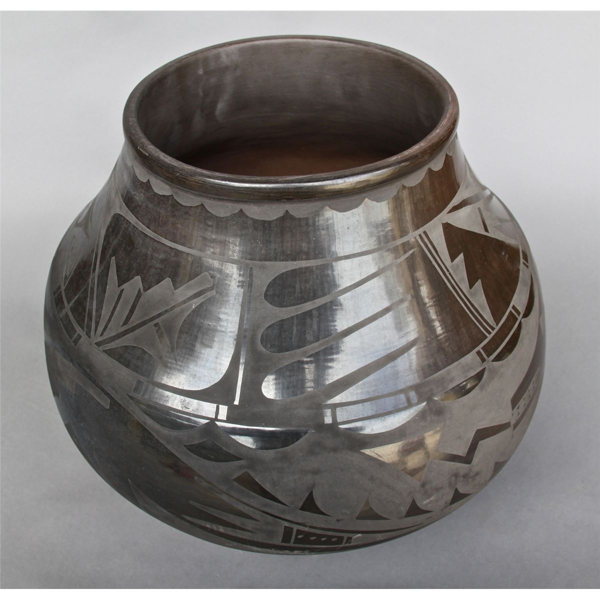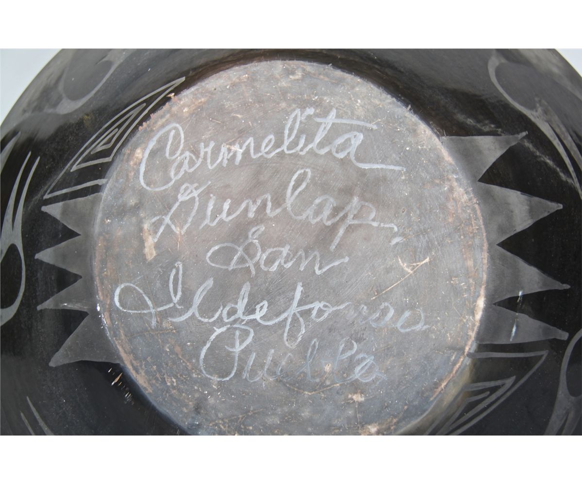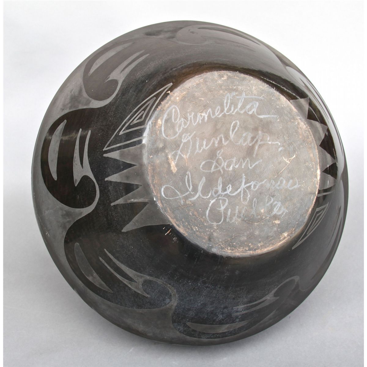Carmelita Dunlap (1925-1999), San Ildefonso Pueblo Southwest, Signed Black on Black Pottery [Height/Length (in)= 14, Width (in)=16.5, Depth (in)=N/A, Weight (lbs)=25] With C.O.A. signed by Chief Joe Dan Osceola & Seminole Tribe. Go to: www.pangaea-auctions.com for more information about this collection.