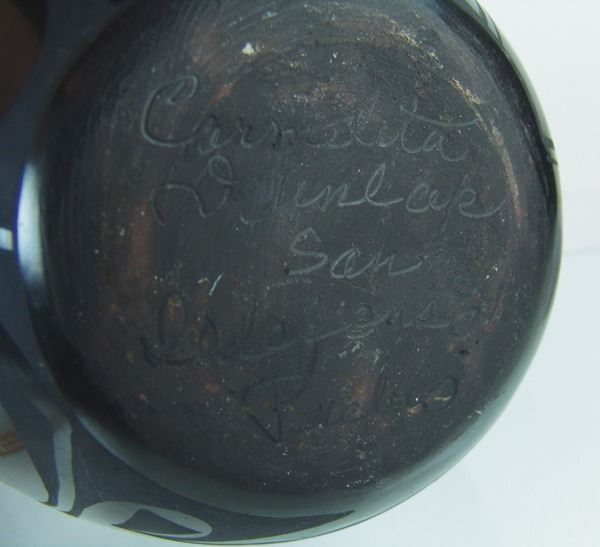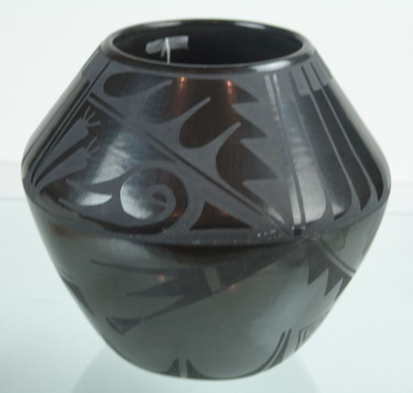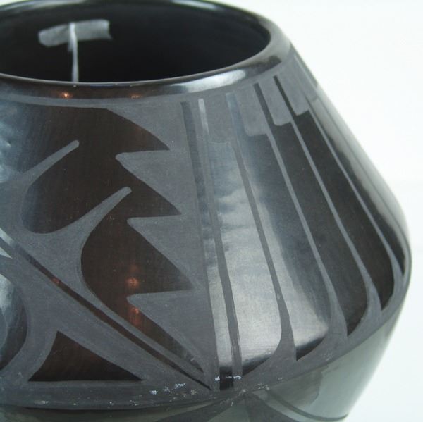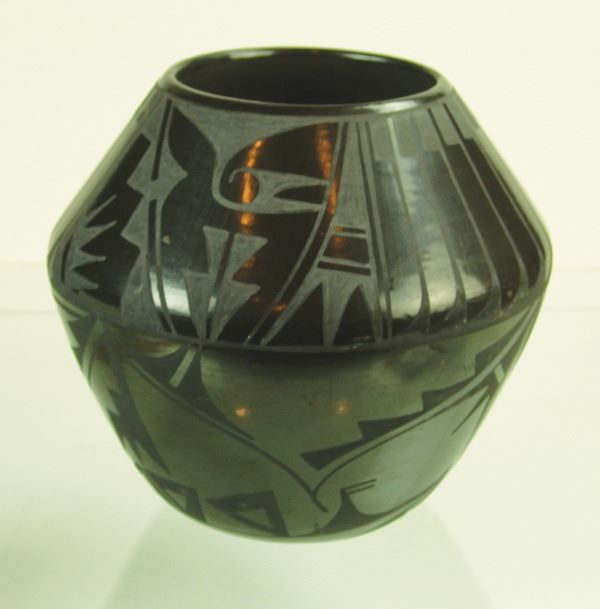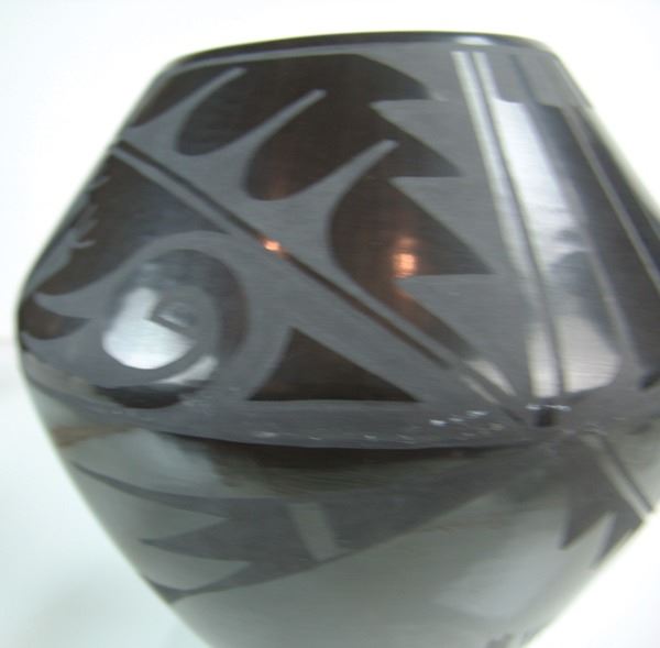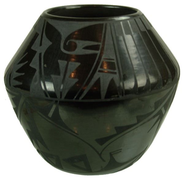 Larger sized, San Ildefonso black-on-black pottery jar with traditional and radiating feather designs above and below the shoulder. Very good condition, minor surface scratches.Ca. 1960s10" x 11"