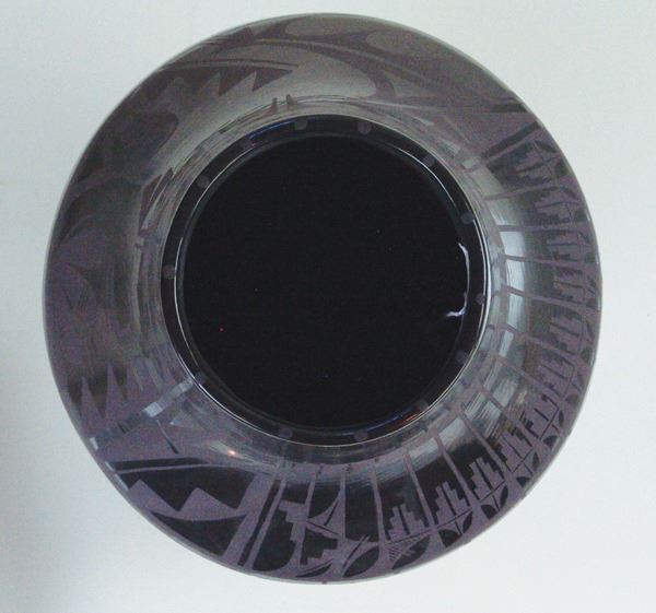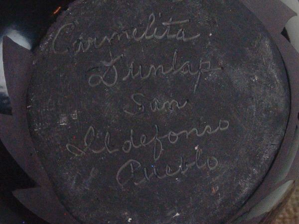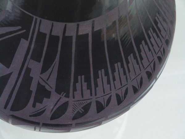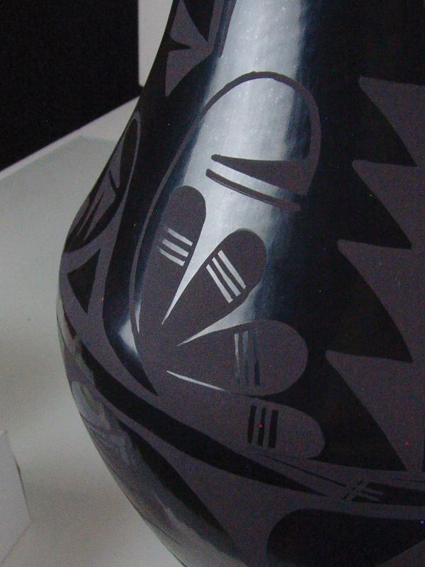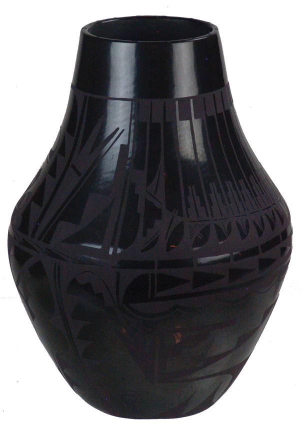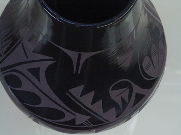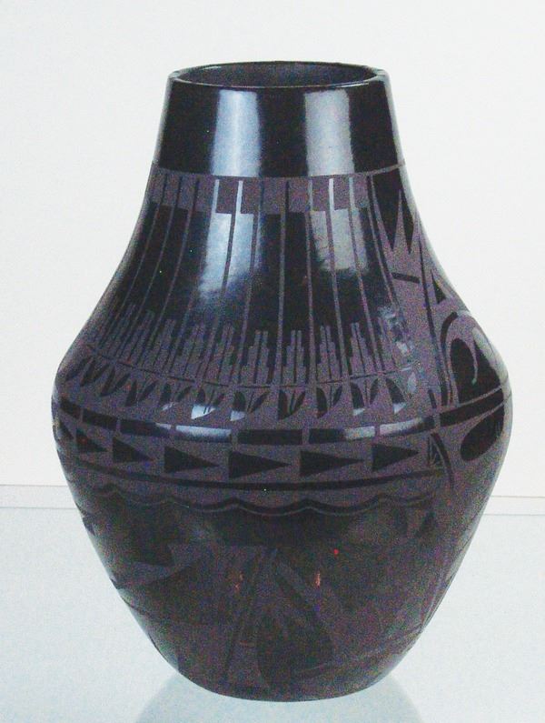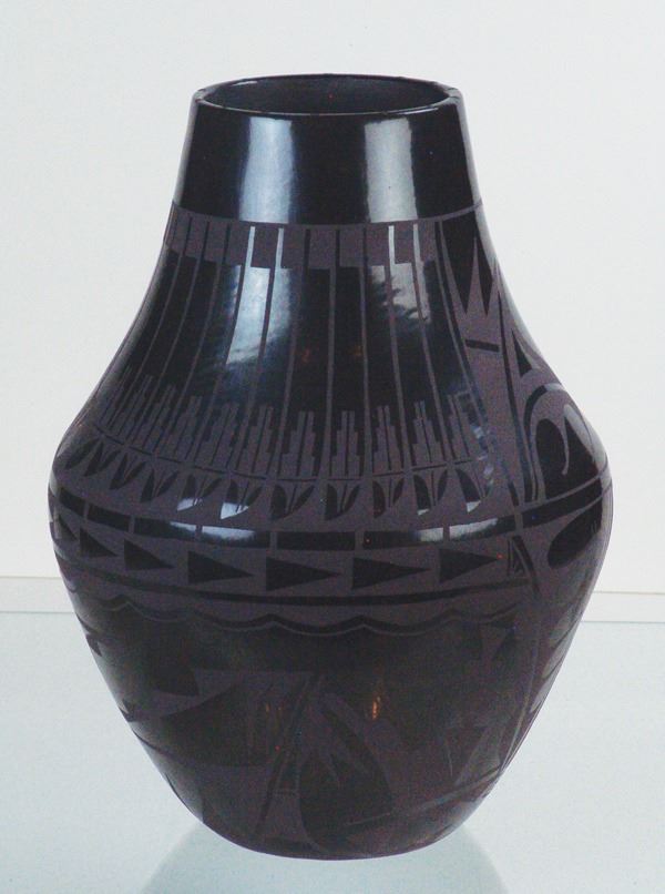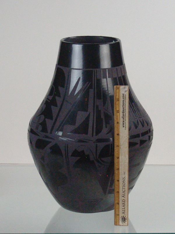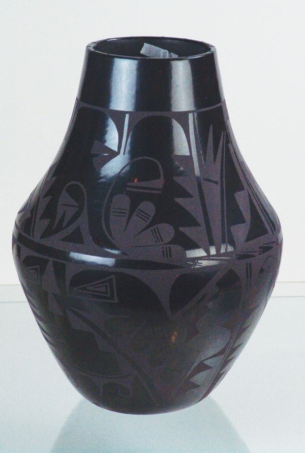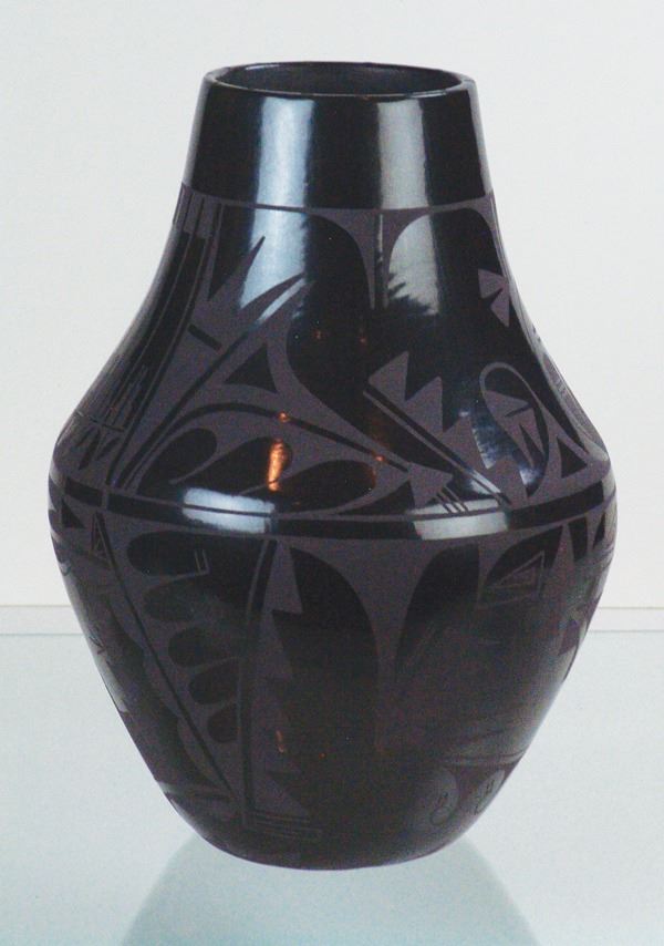 Large, fantastic, San Ildefonso black-on-black pottery jar decorated with elaborate floral ad avian motifs. Very good condition, a museum quality example.Ca.1960s16" x 12"