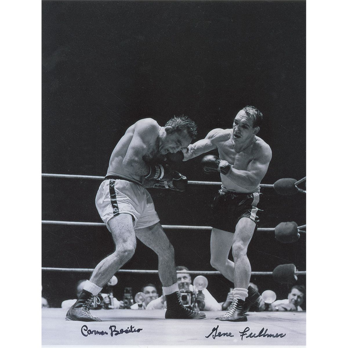 Exciting glossy 11 x 14 photo of the pair battling it out in the ring, signed in black felt tip by both. In fine condition.