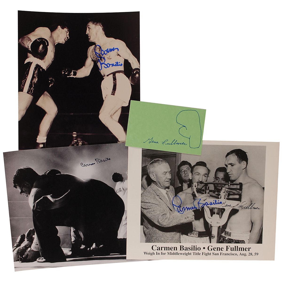 Four items: one 10 x 8 cardstock photo of the Basilio-Fullmer weigh-in, signed in blue and black felt tip by Basilio and Fullmer; two photos of Basilio, 8 x 10 and 10 x 8, signed in blue or black felt tip by Basilio; and one felt tip sketch of a boxing glove on a green 5 x 3 card, signed by Fullmer. In overall fine condition.