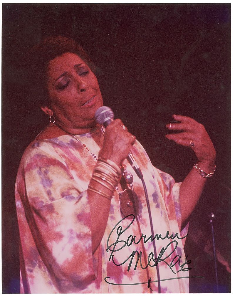 Color satin-finish 11 x 14 photo of McRae performing, signed in black felt tip. Photo is mounted on an identical size mat board. Scattered surface marks, impressions, and spotting, otherwise fine condition.
