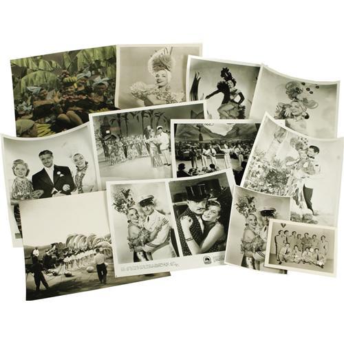 <B>Rare Carmen Miranda Vintage Photos.</B></I> Set of 12 photos includes a b&w snapshot of Carmen Miranda posing with servicemen; a b&w 4" x 7" photo of her with Don Ameche in <I>That Night in Rio</B></I>; nine b&w 8" x 10" promo stills featuring her in such films as <I>Springtime in the Rockies,</B></I> <I>Weekend in Havana,</B></I> and <I>Greenwich Village</B></I>; and a colorized 11" x 14" photo of her in an unknown production, wearing her classic fruit-studded garb. Items are in overall very Fine to Excellent condition with very minor wear.<BR><BR><b>Shipping:</b> Flat Material, Small (<a target="_blank" href="http://www.heritageauctions.com/common/shipping.php">view shipping information</a>)