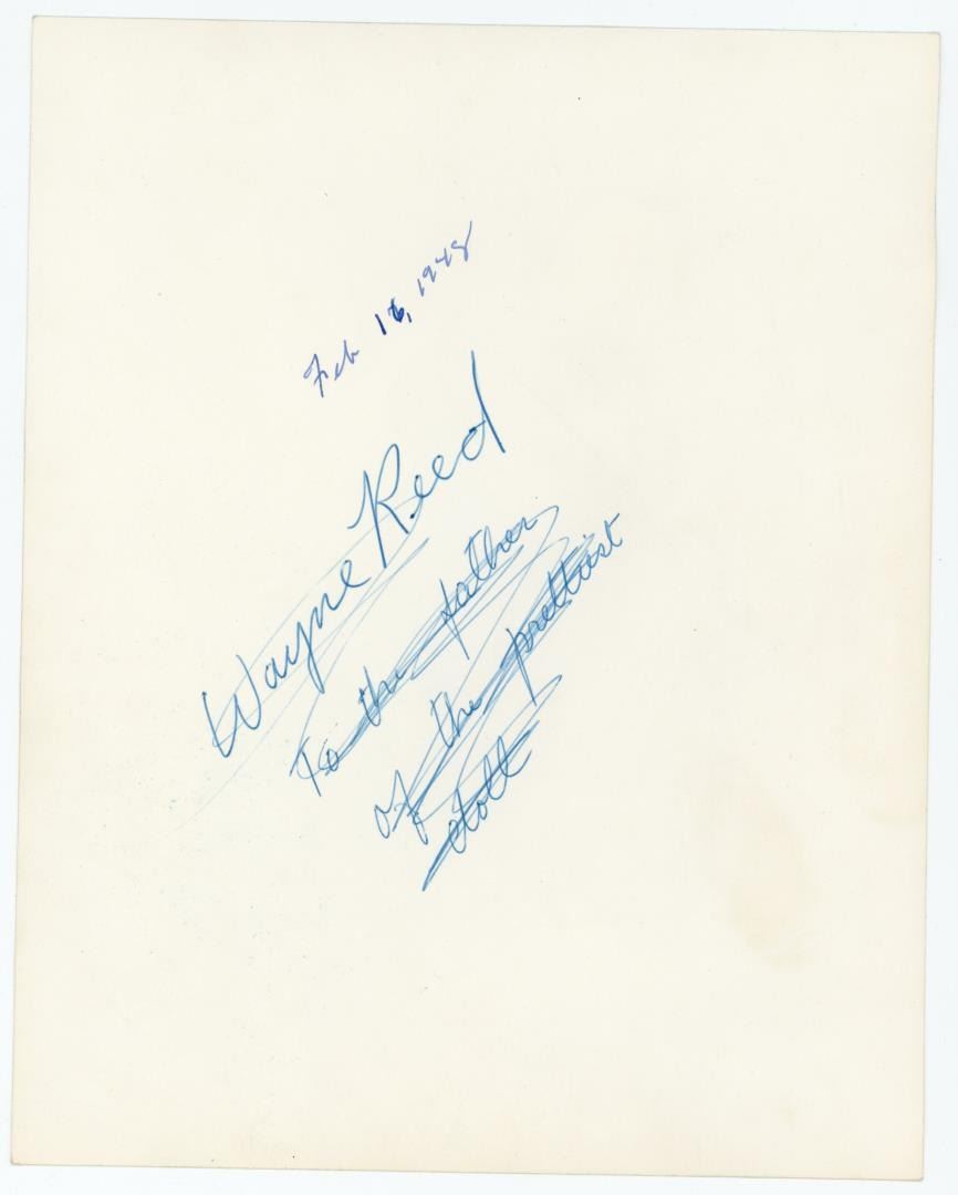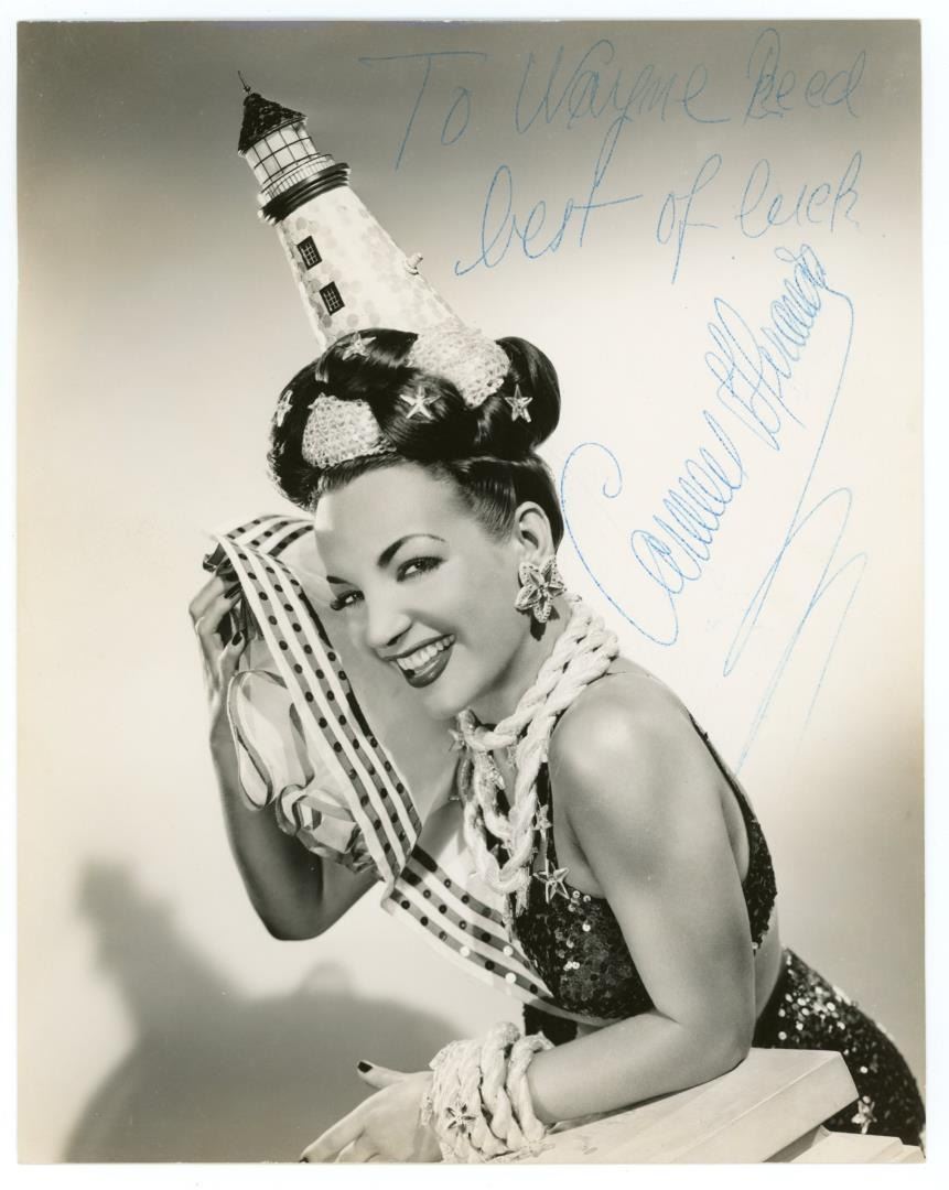 7 1/4" by 9 1/4". Signed as shown. Maria do Carmo Miranda da Cunha (9 February 1909 – 5 August 1955), known professionally as Carmen Miranda was a Portuguese-born Brazilian singer, dancer, and actress. Nicknamed "the Brazilian Bombshell," she was known for her signature fruit hat outfits that she wore in her American films.