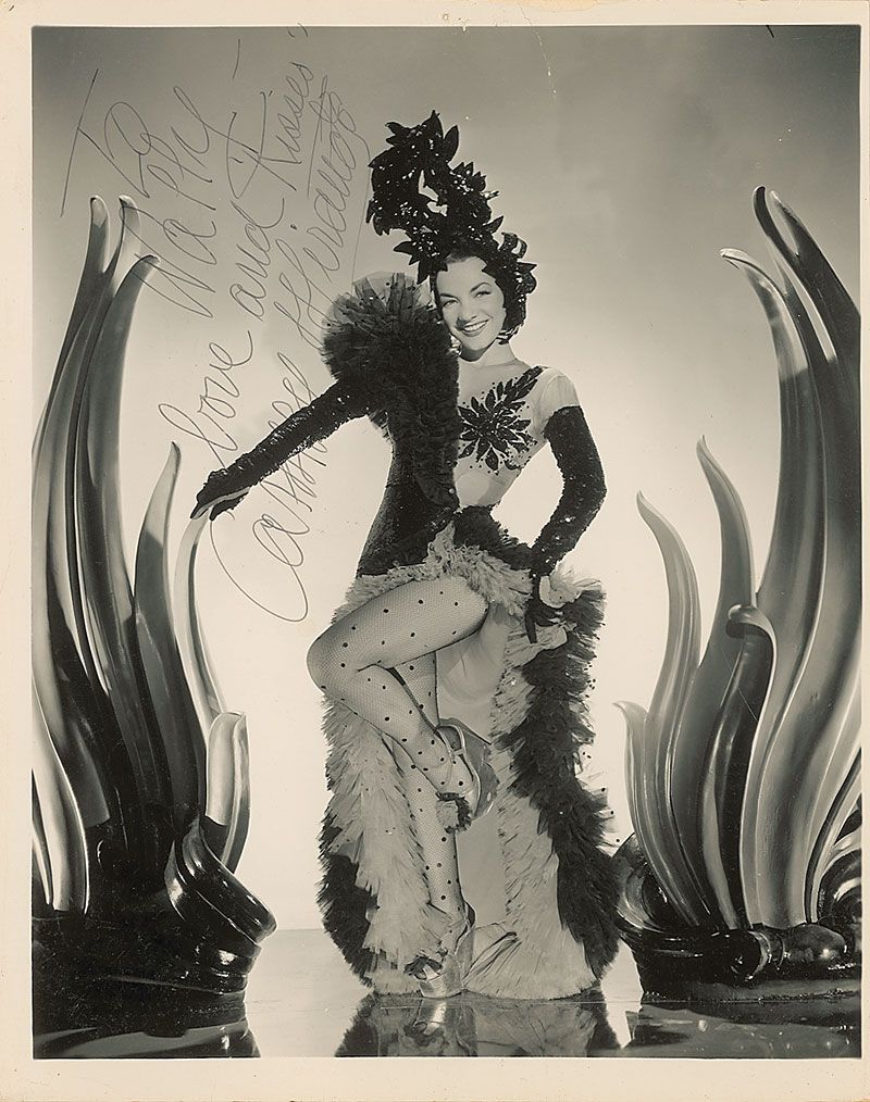 Brazilian samba singer, dancer, and film star (1909–1955). Fabulous vintage glossy 8 x 10 photo of Miranda in an elaborate costume, signed and inscribed in fountain pen, “To Wally—love and kisses, Carmen Miranda.” In very good condition, with tack hole, impressions, and a noticeable tear to upper border. Originates from the estate of Hollywood hairdresser Wally Wallace.