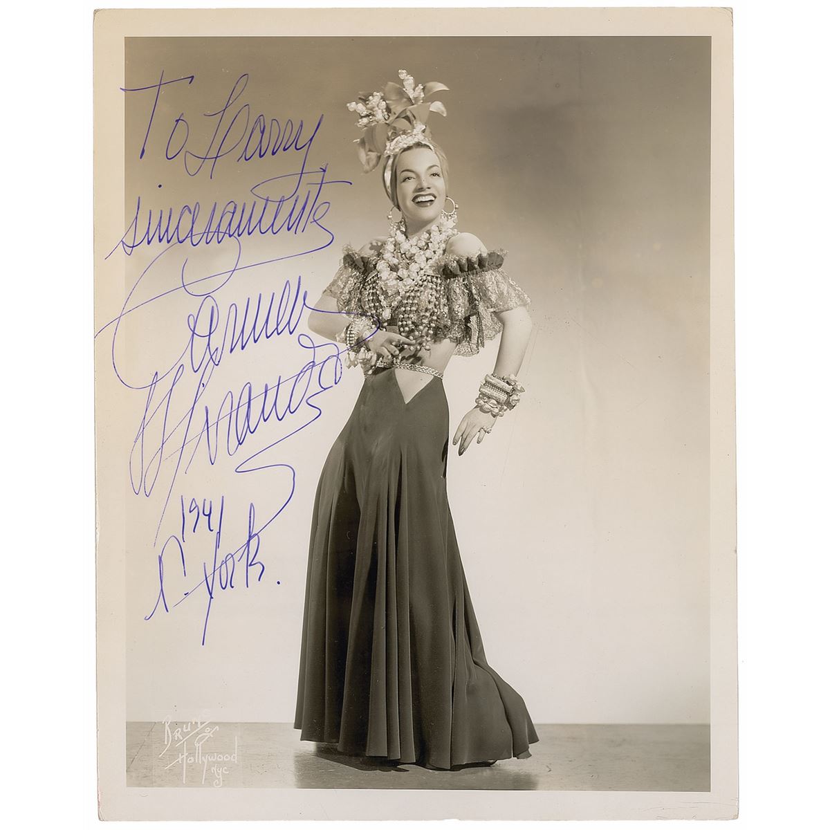 Vintage glossy 8 x 10 full-length photo of a dancing Miranda by Bruno of Hollywood, signed and inscribed in blue ink, “To Larry, sinceramente, Carmen Miranda, 1941, N. York.” Reverse bears a Bruno of Hollywood credit stamp. In fine condition, with slight creasing to corners.