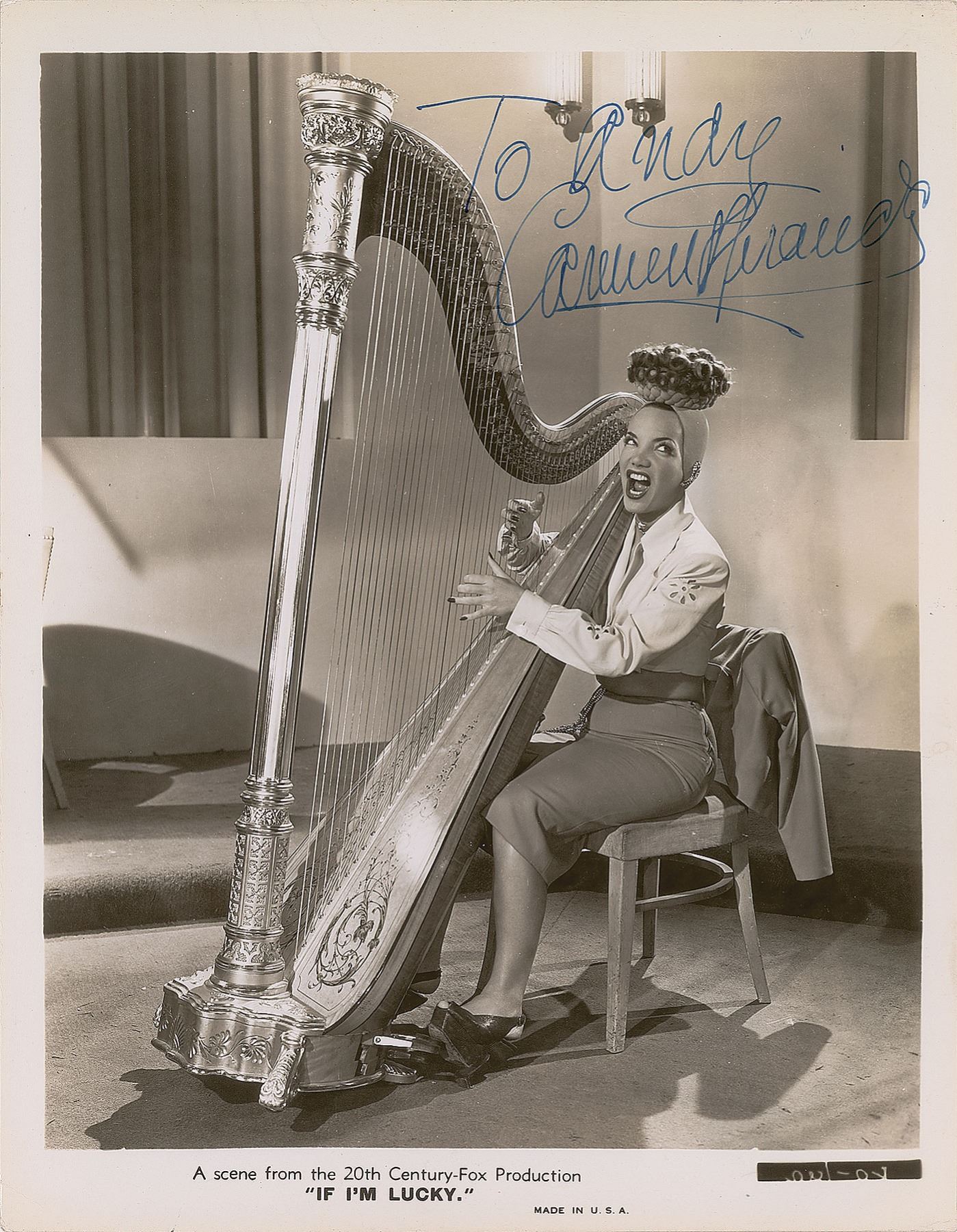 Vintage glossy 8 x 10.25 Twentieth Century-Fox publicity photo of Miranda as Michelle O'Toole from the 1946 musical comedy If I'm Lucky, signed and inscribed in fountain pen, "To Andy, Carmen Miranda.” In fine condition.