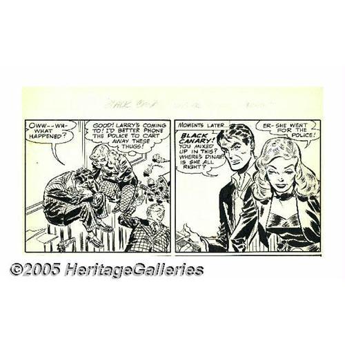 <B>Carmine Infantino - Golden Age Black Canary Unpublished Partial Page Original Art (DC, 1949).</B></I> The Black Canary explains to Larry that Dinah Drake has gone for the police, in this top tier to an unpublished page from the story, ""Special Delivery... Death!"" Gorgeous work by the legendary Carmine Infantino, with two fabulous portraits of the Canary. ""Written off"" by DC editors in 1949, this art was saved from destruction in the 1960s by some DC staffers who, ordered to dispose of the old artwork, cut the pages horizontally in the spaces between the panels, rather than diagonally. The image area measures 13"" x 6"" and, aside from some moderate aging, the work is in Excellent condition. <BR><BR><B>Important notice:</B> Heritage usually auctions material at the rate of 200-250 lots per hour. On some occasions eBay Live bid software or the Internet may not be able to keep up with the pace of the auction. We recommend placing a realistic absentee bid now as insurance to avoid disappointment. Occasionally the auctioneer may eliminate or reject an eBay Live bid, and the auctioneer may also reopen a lot after the close of the eBay live bidding (usually because we missed an audience bid), and may reject your bid even if it shows you as the winning bidder. By bidding via eBay Live, you agree that Heritage may award the lot to another bidder at its sole discretion under the circumstances described above or any other reasonable circumstances. Since eBay bids are not shown to us until we open the lot on the floor, we treat those bids just like floor bids. In most cases the floor responds before the eBay bid is presented to us, due to Internet lag time, so for consistency we have made it a policy that floor bids are always considered first over tie eBay live bids. Also please note that all Heritage lots purchased through eBay Live carry a 20% Buyer's Premium. Please make sure you read the Terms and Conditions before you bid. This lot is being auctioned in conjunction