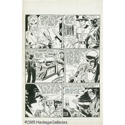 <B>Carmine Infantino - Flash Comics Unpublished Story page 5 Original Art (DC, 1940s).</B></I> From an unpublished story that was apparently slated for <B>Flash Comics</B></I> #112 (unfortunately, the series was cancelled eight issues before that), this pits the Fastest Man Alive against a slick villain called the Thinker who has gotten hold of a time machine. Many similar stories were "written off" (as this page is stamped at the bottom) at the end of the First Heroic Age, when superhero books were being cancelled left and right, and the editors saw no further need for these stories which had been kept in inventory. In the mid-'70s, DC made the decision to destroy most of this artwork, but a couple of enterprising staffers cut the pages horizontally, through the gutters (rather than diagonally as they'd be instructed), to preserve the artwork. This page has been reassembled from the three cut tiers, taped on the back side to restore its original format. All the better to eyeball this bold Infantino artwork. The page measures 14.25" x 22" and, except for the cuts between tiers, is in Excellent condition.