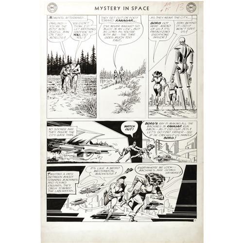 <B>Carmine Infantino and Murphy Anderson - Mystery in Space #85, Adam Strange page 11 Original Art (DC, 1963).</B></I> Check it out, a mechanical menace named "Borg?" -- maybe the "Star Trek: the Next Generation" writers were die-hard fans of Adam Strange! DC legend Carmine Infantino detailed this Silver Age thriller showcasing Adam Strange and his gal-pal Alanna in page 11 from the yarn, "Riddle of the Runaway Rockets." Murphy Anderson added the perfect Silver Age finish to this star-spanning spectacular. This page has an image area of 13" x 18", and the art is in Excellent condition. <BR><BR><b>Shipping:</b> Flat Material, Large (<a target="_blank" href="http://www.heritageauctions.com/common/shipping.php">view shipping information</a>)
