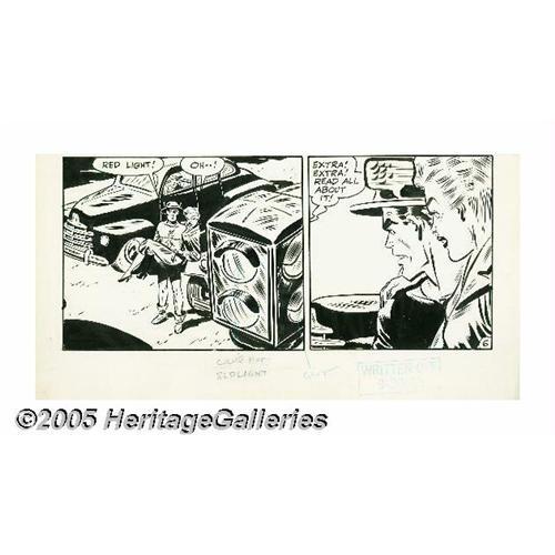 <B>Carmine Infantino and Bernard Sachs - Golden Age Flash Unpublished Partial Page Original Art (DC, 1948).</B></I> As was noted in Roy Thomas' " "<B>Alter Ego</B></I> #12 article, ""Written off 9-30-49, Part II, ""In 1949 National Comics Publications, Inc. (a.k.a. DC), elected to ""write off"" what may be amounted to hundreds page of unpublished comic art and story, no doubt in order to get a one-time tax break. Many of these pages were stamped 'Written Off - 9-30-49"" or later. During 1967-68, Marv Wolfman, an intern at the time, was ordered by production chief Sol Harrison to cut the pages of art into three pieces. Wolfman did as ordered, but he cut many of them carefully between panel tiers and he was allowed to cart off hundreds of the pages and demi-pages, dated from the 1940-60 era. In this bottom tier from an unpublished page, the Flash has to make a quick stop -- at a traffic light! The image area is 13"" x 6"" and the art is in Excellent condition. <BR><BR><B>Important notice:</B> Heritage usually auctions material at the rate of 200-250 lots per hour. On some occasions eBay Live bid software or the Internet may not be able to keep up with the pace of the auction. We recommend placing a realistic absentee bid now as insurance to avoid disappointment. Occasionally the auctioneer may eliminate or reject an eBay Live bid, and the auctioneer may also reopen a lot after the close of the eBay live bidding (usually because we missed an audience bid), and may reject your bid even if it shows you as the winning bidder. By bidding via eBay Live, you agree that Heritage may award the lot to another bidder at its sole discretion under the circumstances described above or any other reasonable circumstances. Since eBay bids are not shown to us until we open the lot on the floor, we treat those bids just like floor bids. In most cases the floor responds before the eBay bid is presented to us, due to Internet lag time, so for consistency we have made it a policy that flo