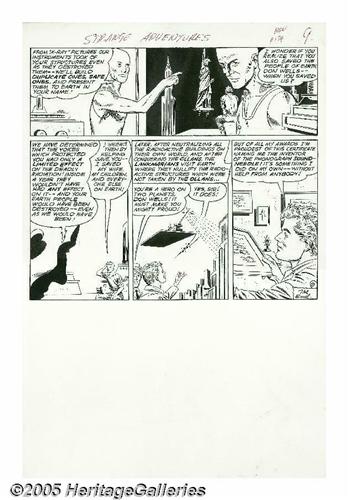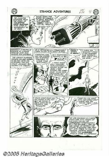 <B>Carmine Infantino and Joe Giella - Strange Adventures #134, page 4 Original Art (DC, 1961).</B></I> The Statue of Liberty is turned into a weapon by Outer Space Aliens in this startling scene from "The Aliens Who Invaded New York." With years of experience in science fiction fandom and pulp magazines, editor Julius Schwartz was an ideal <I>mayordomo</B></I> for DC's science fiction comics. Carmine Infantino and Joe Giella were on Schwartz's "A-Team" of artists, and the talented twosome teamed to revolutionize Silver Age comics with their streamlined designs. The image area of the page is 13" x 18", and the art is in Excellent condition.