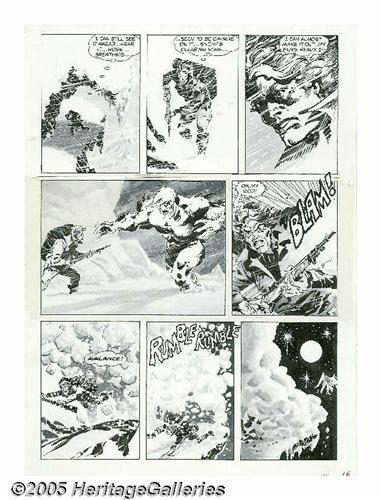 <B>Carmine Infantino and Walt Simonson - Creepy #85, page 16 Original Art (Warren, 1985).</B></I> For the chiller "Hide and Go Mad," Silver Age legend Carmine Infantino penciled this harrowing showdown between a fearsome Yeti and a hunter. Infantino's pulse-pounding pencils were superbly inked by one of his artistic discoveries -- Walt Simonson. After he had graduated from Rhode Island School of Design in 1972, Walt Simonson recalled, "I took a portfolio of work that I had written, pencilled, and inked called <B>The Star Slammers</B></I> into DC Comics and through a series of happy accidents, ended up showing it to Carmine Infantino who was essentially editor in chief at the time. Carmine liked my stuff and had his editors give me work." The two artists make for a talented team! The image area of this piece is 10.5" x 15". Panels four and five (in the middle panel tier) were cut out and taped onto the page, and panel four also has an art correction pasted over a sound effect balloon; otherwise the art is in Very Good condition.