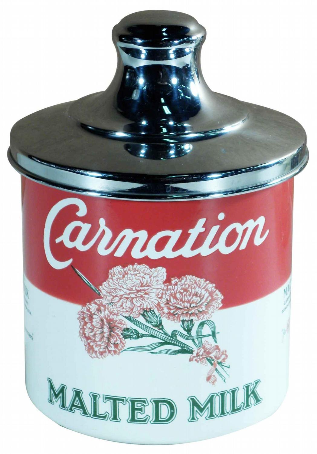 Carnation Malted Milk Canister with lid. Enamel porcelain over steel, aluminum lid. Near mint condition. 6 1/4 inch diameter X 8 1/4 inches tall.