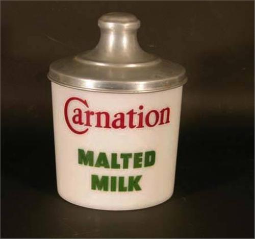 carnation malted milk canister, milk glass, original lid, no chips or cracks.