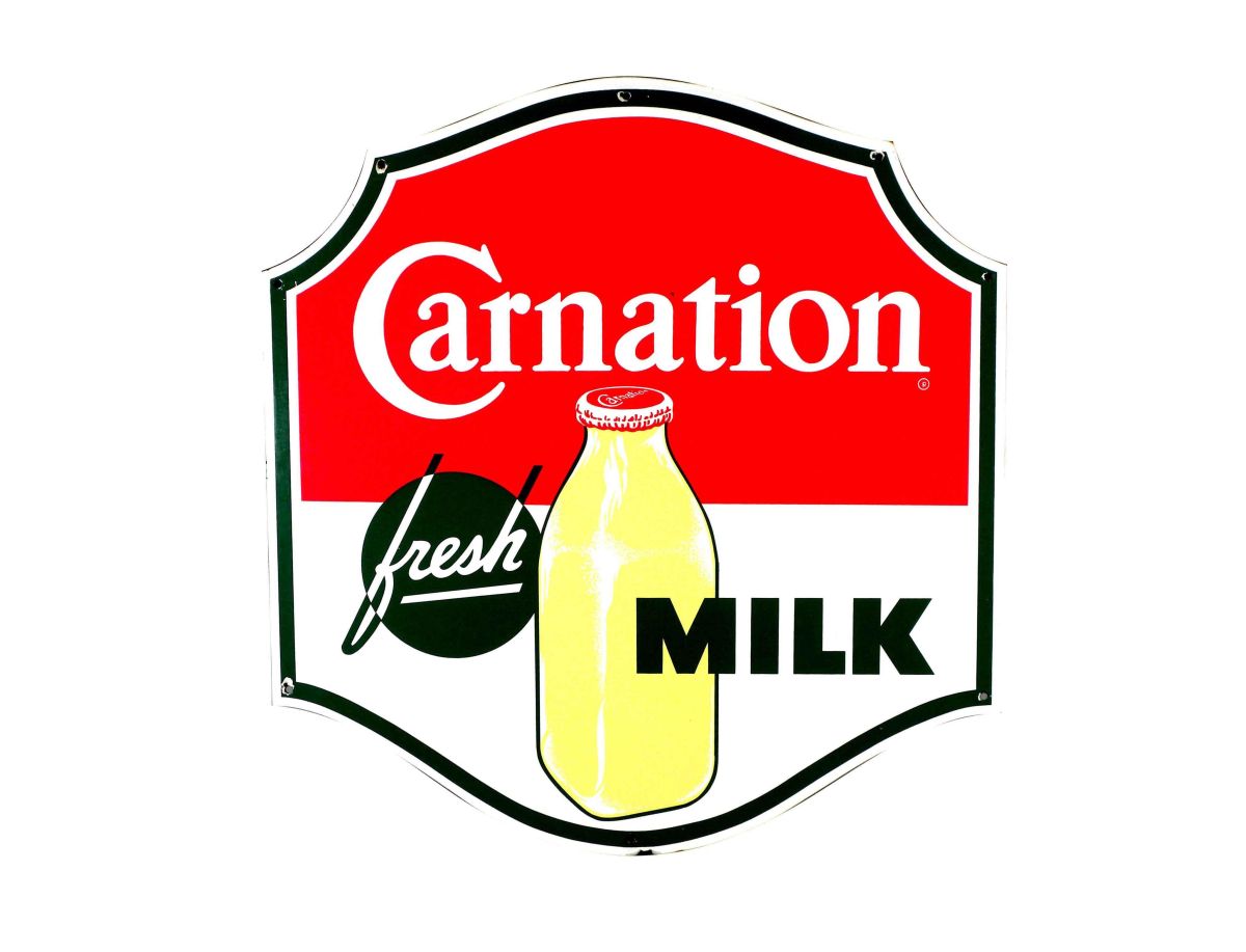 Carnation Milk Die Cut Porcelain Sign, one sided. Tiny chip at 6:00 otherwise excellent condition. 22 X 23 inches.