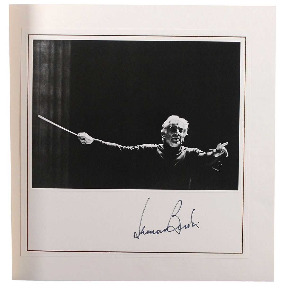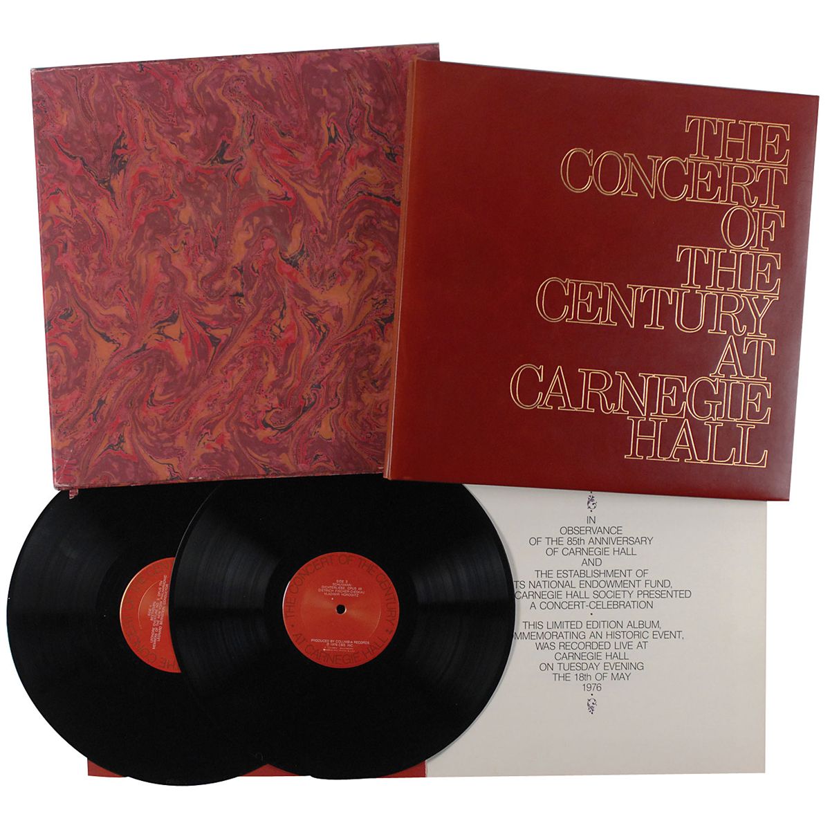 Signed book: The Concert of the Century at Carnegie Hall. Limited edition of 1000 copies (this being No. 339). NY: Carnegie Hall Society, 1977. Softcover with custom slipcase, 12 x 12. Signed in black ink under their respective full page images by Leonard Bernstein, Dietrich Fischer-Dieskau, Vladimir Horowitz, Yehudi Menuhin, Mstislav Rostropovich, and Isaac Stern. Book is complete with its two albums and presentation folio. In fine condition. A magnificent production, issued to commemorate the famous concert-celebration held by the Carnegie Hall Society on Tuesday, May 18, 1976, in honor of the 85th anniversary of Carnegie Hall and seldom available for sale.