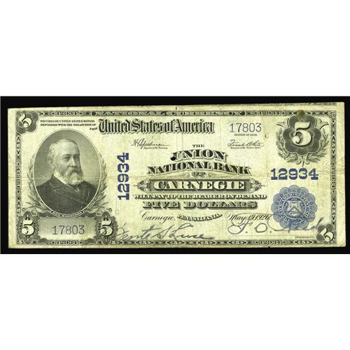 <B>Carnegie, PA</B></I> - $5 1902 Plain Back Fr. 609 <B>The Union NB</B></I> Ch. # 12934<BR>Despite having spent more years than we like to admit in this business, every once in a while a note comes along that defies rational explanation. This is one of those items. Although this bank had a large size issue of 18924 sheets (all of which were $5 examples) during a three year time frame, this piece is the first large note to be reported from the bank. Both the Kelly census and the Gengerke data, along with our own records, confirm that this piece, is, at least for now, unique in large size. While clearly an anomaly, we can suggest no reasonable explanation why a well capitalized institution issuing almost 20,000 sheets, even if at the end of the large size issuing period, should have only one survivor extant to date. <B>Fine,</B></I> with a small hole at the "U" of Union in the title, an almost impossible note to estimate, although our best guess here is somewhere between...