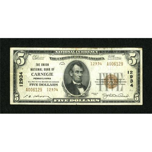 <B>Carnegie, PA</B></I> - $5 1929 Ty. 2 <B>The Union NB</B></I> Ch. # 12934<BR> This is a picture perfect <B>Very Fine </B></I>from a bank that issue both 1902 Plain Back $5s and 1929 Type 1 and 2 $5s. Interestingly, none of the large size notes have ever surfaced.<BR><BR><b>Shipping:</b> Coins & Currency (<a target="_blank" href="http://www.heritageauctions.com/common/shipping.php">view shipping information</a>)