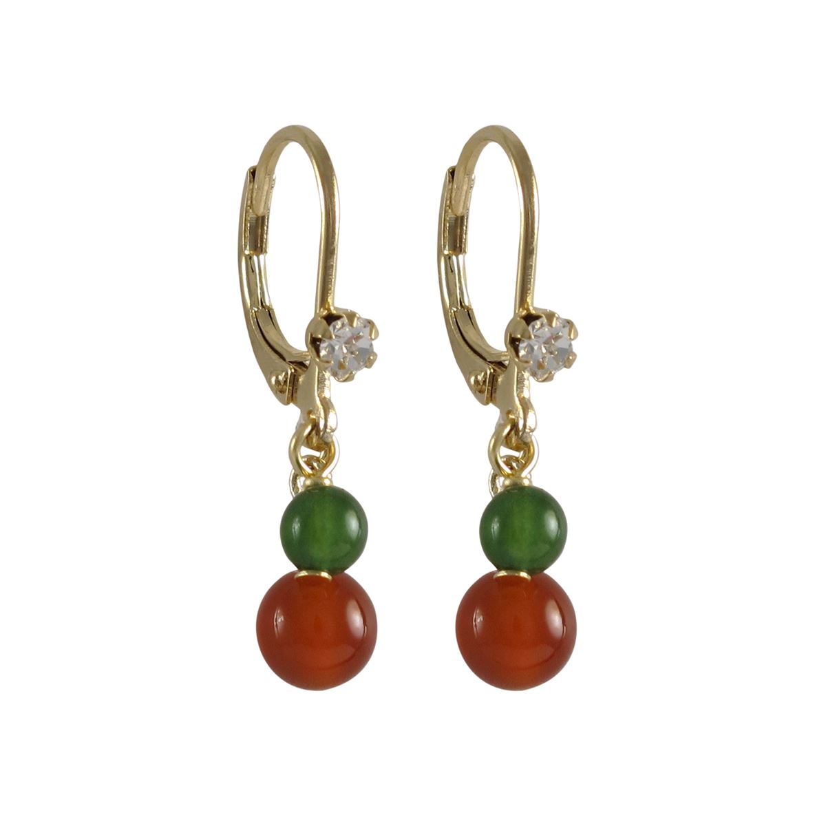 Carnelian 6Mm And Green Jade 4Mm Semi Precious Balls Dangling, Gold Plated Surgical Steel Lever Back With White Crystal Earrings, 1.02"
