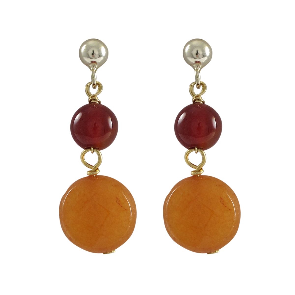 Carnelian 6Mm Round Ball And Honey 10Mm Round Flat Semi Precious Stones Dangling, On Gold Plated Sterling Silver 4Mm Ball Post Earrings, 1.10"