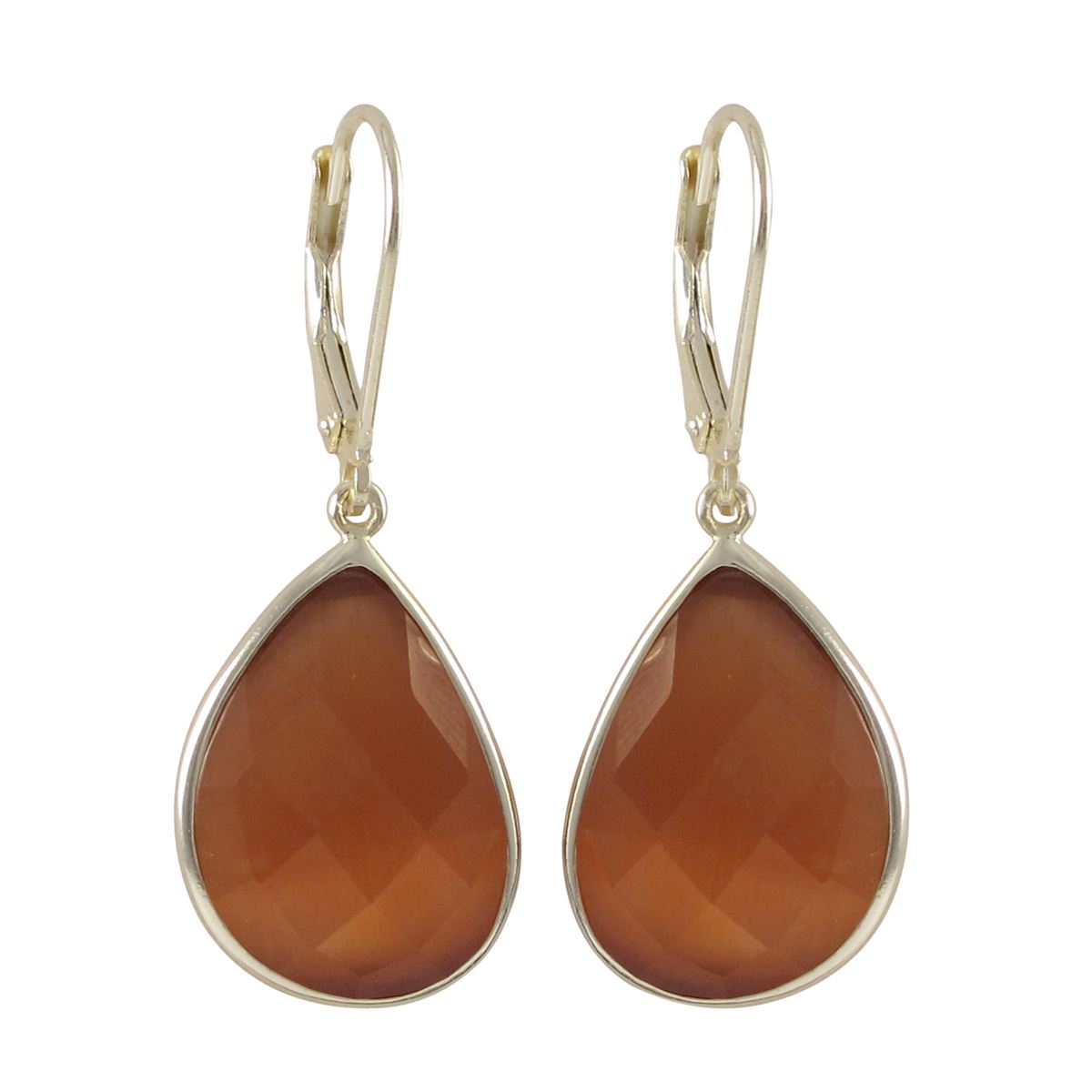 Carnelian Cat's Eye Semi Precious Faceted Stone On Gold Plated Sterling Silver Lever Back Earrings, 1.44&Quot;
