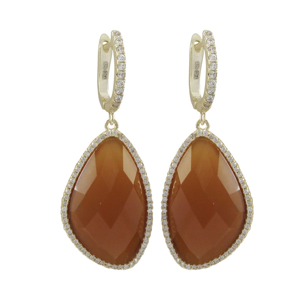 Carnelian Cat's Eye Semi Precious Faceted Stone, With CZ Border, On Gold Plated Sterling Silver Lever Back Earrings, 1.77&Quot;