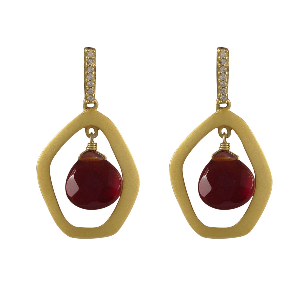 Carnelian Semi Precious Teardrop Stone In Gold Plated Matte Sterling Silver Open Pentagon Shape CZ Post Earrings, 1.34"