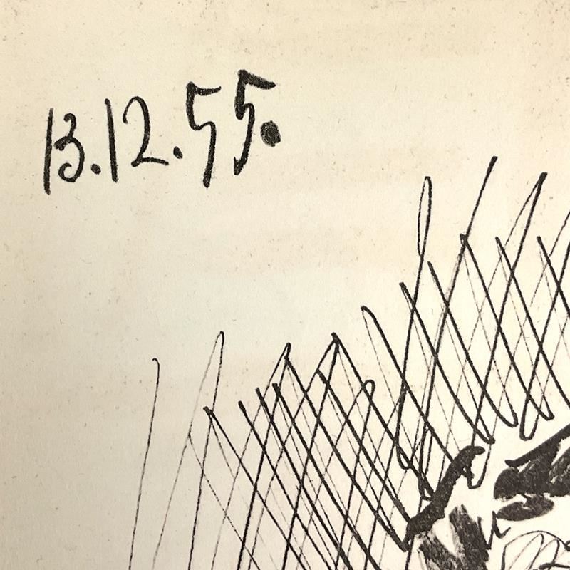 "Carnet de Californie 13.12.55" is a vintage lithograph on paper by Pablo Picasso (1881-1973). This piece is from Picasso's Carnet de Californie Series and was printed in Paris, France by Mourlot Studios in 1959. This piece comes framed. Includes Letter of Authenticity. Measures approx. 18.5" x 24.5" (frame), 10.5" x 16.5" (image). This item requires special handling and may have a longer than usual turnaround.