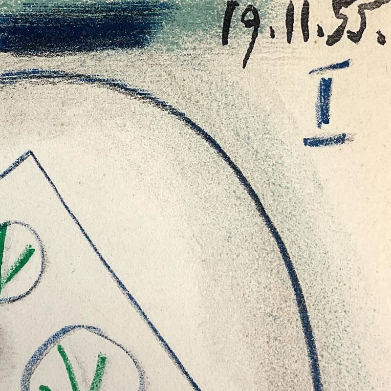 "Carnet de Californie 19.11.55-I" is a vintage lithograph on paper by Pablo Picasso (1881-1973). This piece is from Picasso's Carnet de Californie Series and was printed in Paris, France by Mourlot Studios in 1959. This piece comes framed. Includes Letter of Authenticity. Measures approx. 18.5" x 24.5" (frame), 10.5" x 16.5" (image). This item requires special handling and may have a longer than usual turnaround.