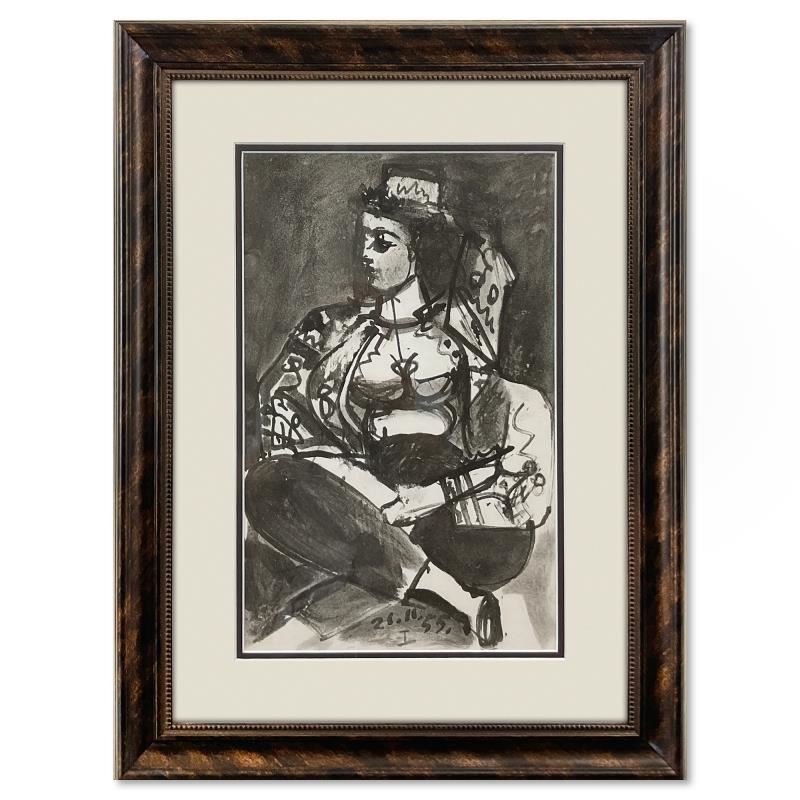 "Carnet de Californie 21.11.55-I" is a vintage lithograph on paper by Pablo Picasso (1881-1973). This piece is from Picasso's Carnet de Californie Series and was printed in Paris, France by Mourlot Studios in 1959. This piece comes framed. Includes Letter of Authenticity. Measures approx. 24.5" x 18.5" (frame), 16.5" x 10.5" (image).