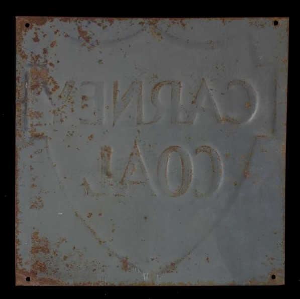 Offered for bidding in this lot is an early embossed tin sign originating from 1904-1920, from Sheridan County, Wyoming - In the form of a Carney Coal Company, embossed tin advertising sign. The Carney Coal Company was established in 1904 by timber and coal magnates, W.J. Carney of Chicago, and his brother Bernard J. Carney of Omaha. Through strike, and hardship of a small mining town, the company name was changed to "Kleenburn" in 1924, and operations were taken over by Sheridan Wyoming Coal Company. The sign shows rich red, deep black, and off-white finish, and reads "Carney Coal Trade Mark - The Kemper-Thomas CO. Cincinnati. O.". The sign is in good condition overall, it does show some patina indicative of age. The sign measures 9 1/4" x 9 1/8".