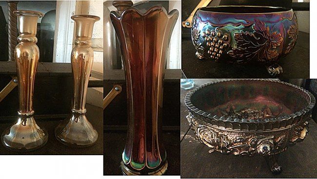 Carnival & Colored Glass Lot. Full curio cabinet filled with beautiful Carnival and colored glass, vaseline, opalscent, hobnail, ruby, cobalt, green, frosted, and clear glass. Procelain, colbalt blue decanter, child's Westmoreland "Thumbalina" punch bowl with miniature cups in purple Carnival glass, plates, candle sticks, porcelain oriental decanter with dragon and elephant, and more! Absolutely stunning! Many pieces are Westmoreland, straight from the Westmoreland Glass Co. in PA.