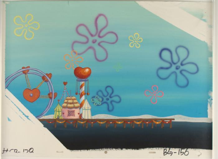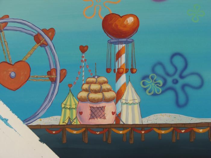 This original hand-painted backgroundl is from the Nickelodeon TV show SpongeBob Squarepants. The story takes place under the deep blue sea in Bikini Bottom, where SpongeBob resides. SpongeBob, who is a yellow, porous sponge, is your typical happy-go-lucky character, as he is always cheerful and enjoys making people laugh. Patrick Star, SpongeBob's neighbor who is a starfish, is your average children's show idiot, as he boasts knowing nothing and is often getting himself into ridiculous situations. Between the homes of these two lies the home of the miserable Squidward, a squid, who is known for being grouchy and playing tricks on SpongeBob and Patrick. Both SpongeBob and Squidward work at the Krusty Krab, a fast food business run by the greedy money-loving Mr. Krabs, a crab, the arch rival of the evil, possibly misunderstood, Plankton. Another neighbor, Sandy Cheeks, an athletic squirrel who normally wears an astronaut's space suit, was introduced in "Tea at the Treedome." She spends most of her time inventing and experimenting. Step right up, come one come all. Experience what the papers call one the best carnival's in all of Bikini Bottom. Bring the friends, family, relatives, and even the grandparents. Once you've enter, you'll never want to leave. Original Production Handpainted Background Overall Size: 13 1/2" x 18 1/2"Very good condition; it has been stored rolled Original Production Backgrounds are used in the making of the final version of animated productions. The background establishes the location and the overall good mood of the scene. Typically, a background layout artist creates a drawing to establish the content of the scene, placement of characters, perspective and camera angle. Based on this drawing, the background artist creates a preliminary painting to confirm all of the scenes details, then the final production background which is used in the filming of the scene. When these backgrounds are individually photographed behind the progression of production cels, and projected at a rapid succession, the images in the foreground appear to move, creating an animated scene. The background is ready to be matted and framed. It is a colored background with the animator's notations at the bottom. The images' corners have been removed.