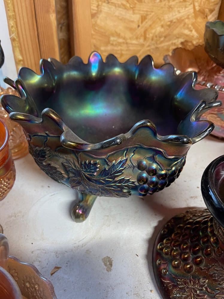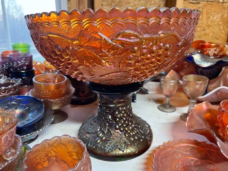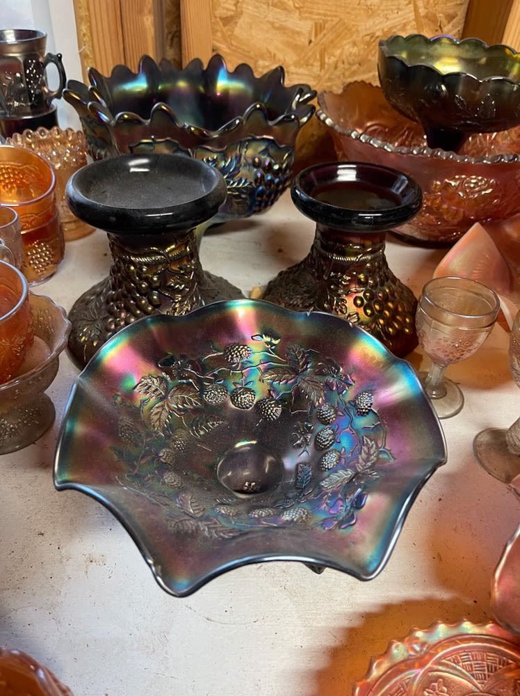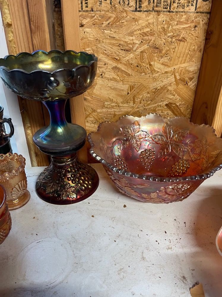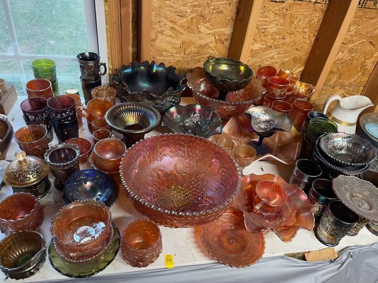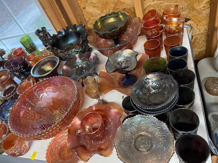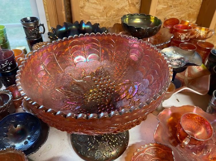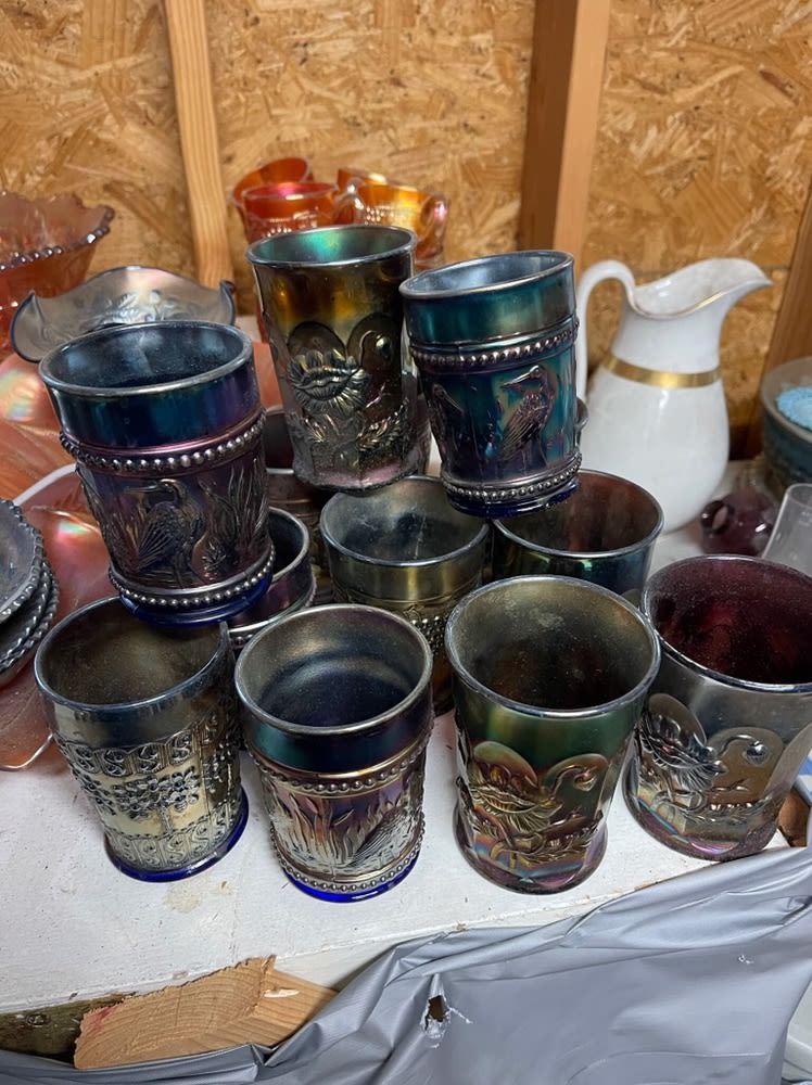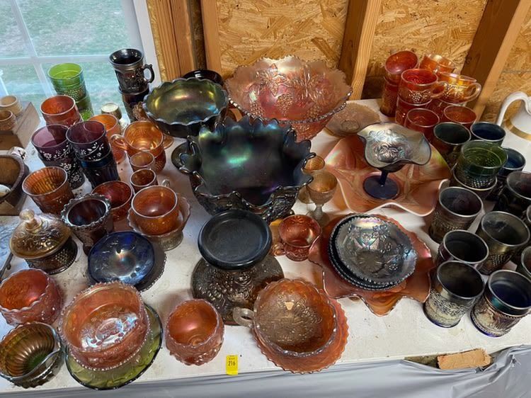 Carnival Glass Collection, approx. 75 pieces, all from the attic! Collection includes Northwood, bowls, tumblers, teacups, plates, various colors and patterns.