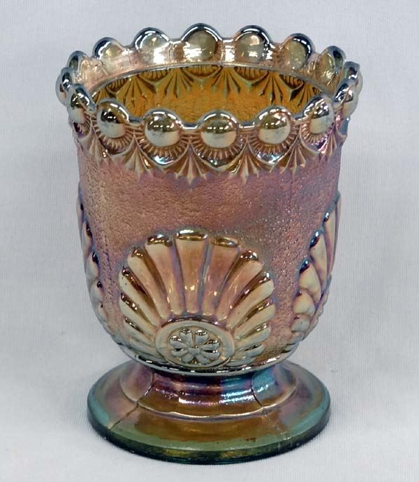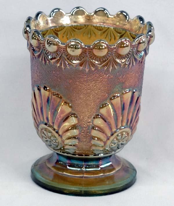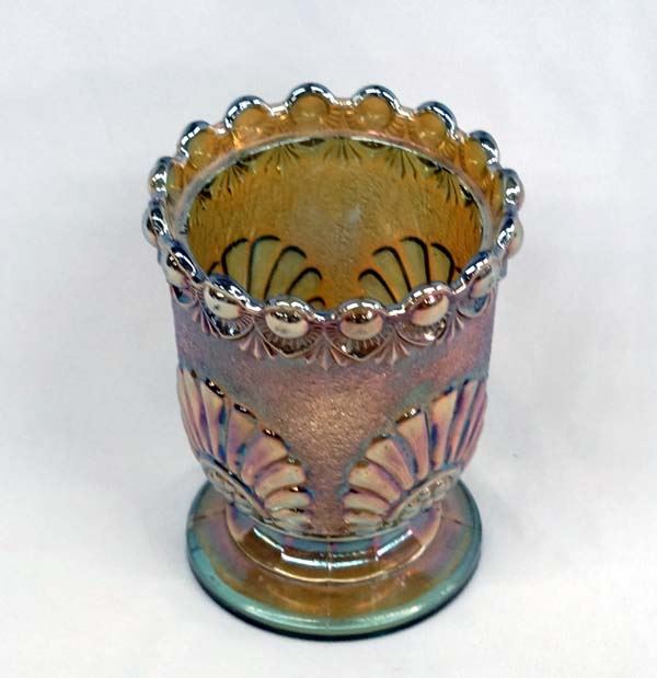 Carnival Glass Green on Gold Spooner. This piece with its beautiful raised designs measures approx. 4''H x 3''W.