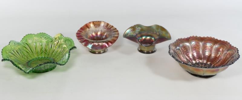 Carnival Glass in Various Patterns (4 pcs), Carnival Glass in Various Patterns (4 pcs) | DIMENSIONS: Tallest Height 3 3/4 inches | CONDITION: Very Good Condition