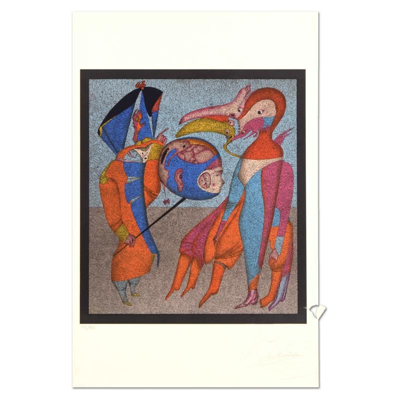 "Untitled 9" is a limited edition lithograph on paper from Mihail Chemiakin's Carnival Series, numbered and hand signed by the artist. Includes Certificate of Authenticity. Measures approx. 21" x 29.5" (border); 17.5" x 21" (image). ** Please note: there is a tear on the bottom-right edge of the image. **