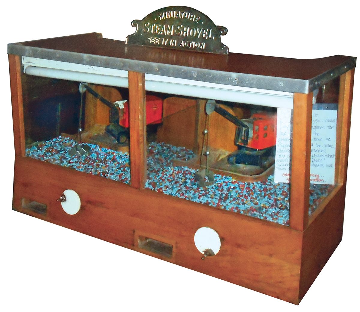 Carnival game, "Miniature Steam Shovel-See It In Action", 2 player w/mechanical pressed steel steam shovels, c.1940's-50's, has merchandise chute cover plates but are not shown in picture, VG cond, 36"H x 50"W x 20"D.