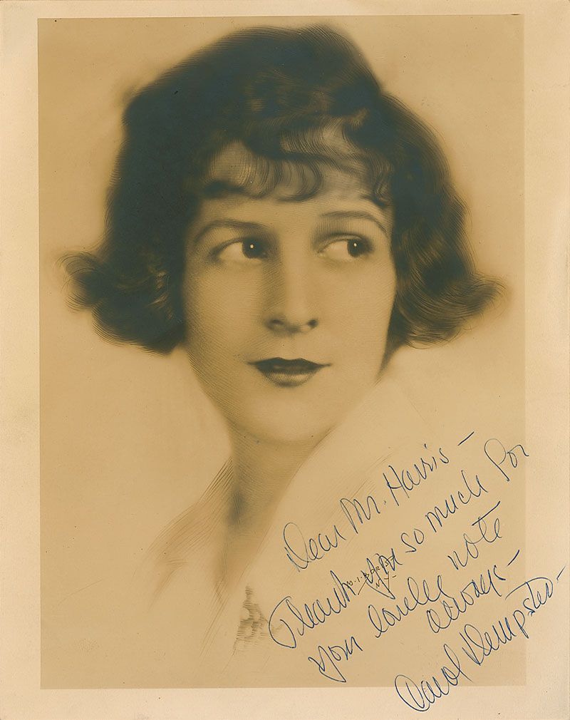 Vintage sepia matte-finish 8 x 10 photo, signed and inscribed in blue ballpoint “Dear Mr. Harris—Thank you so much for the lovely note, always—Carol Dempster.” In fine condition, with some light silvering to darker areas of image.