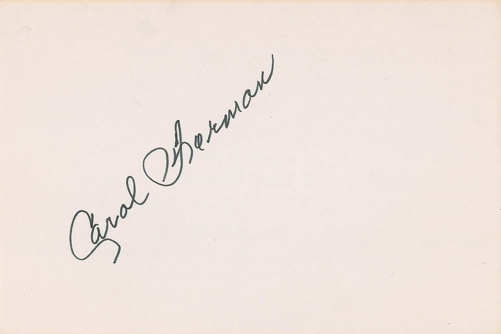 Cult actress (1918–1997) who frequently played exotic villains in serials, appearing in The Black Widow (title role), Superman ’48 (as Spider Woman), Brick Bradford (as Queen Khana), Blackhawk, and Federal Agents vs. The Underworld. Felt tip signature, “Carol Forman,” on an off-white 6 x 4 card. In fine condition. Originally acquired from the Buddy George Marshall in-person Hollywood collection.