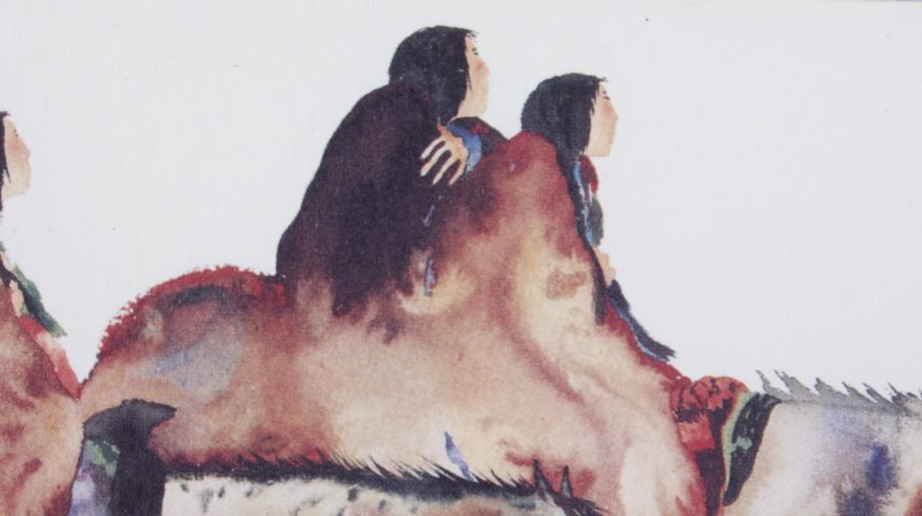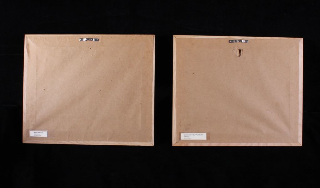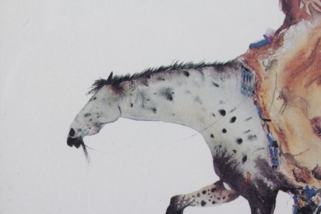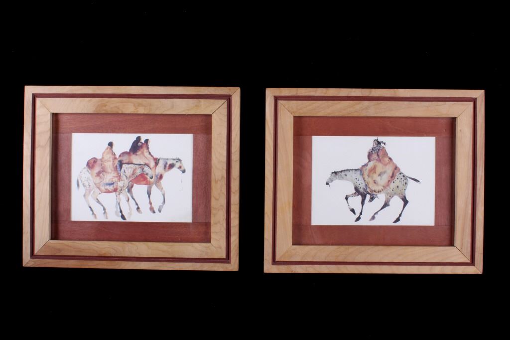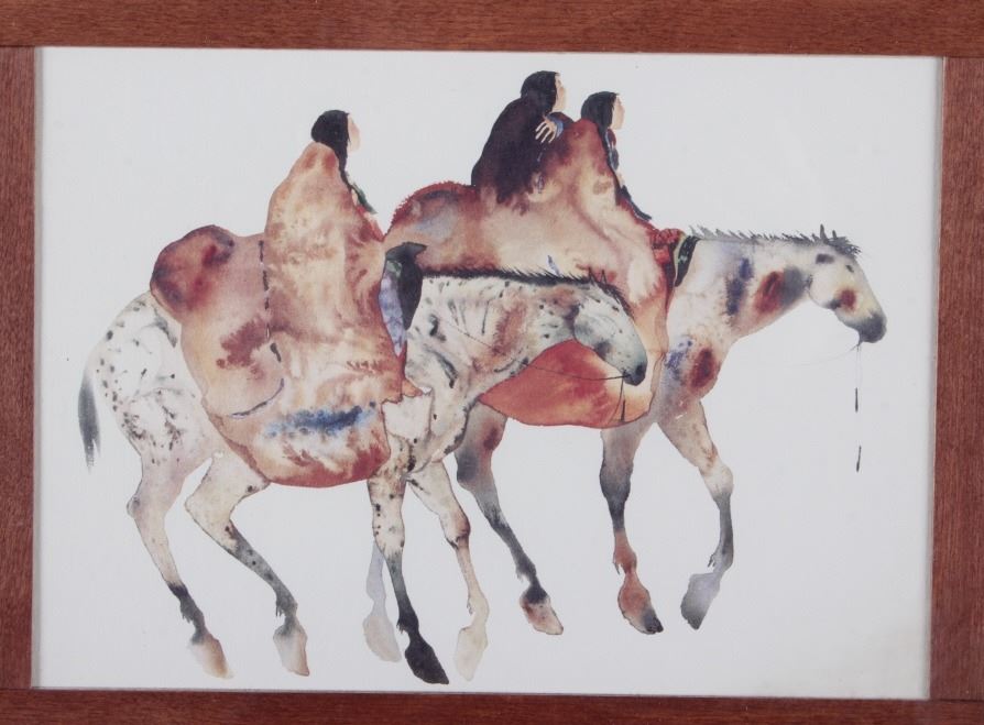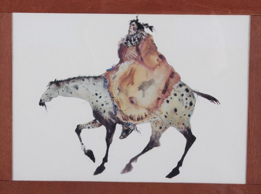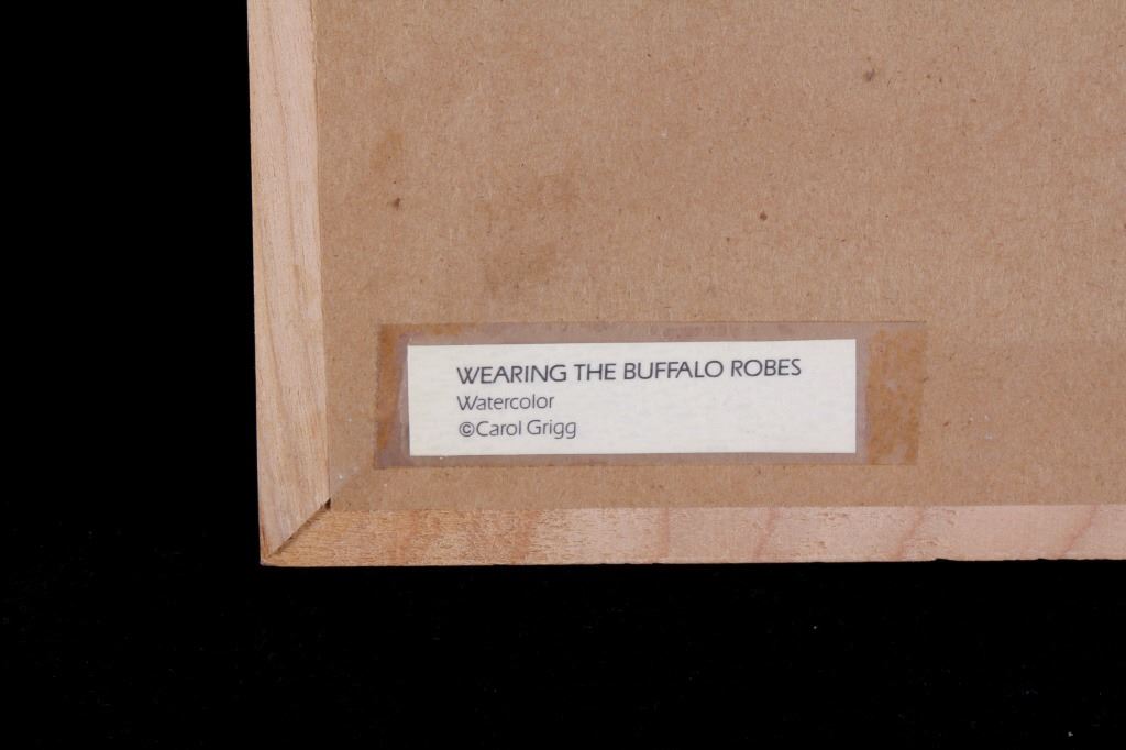 Offered in this lot we have these two Carol Griggs Native American Watercolor Lithograph. Carol Griggs is a self taught Cherokee painter living in southern Oregon and is known for her paintings horses and Native American women primarily in watercolors. The first painting, titled "Birth Path II", shows three Native American women on horseback all wrapped to keep warm in blankets. The second, titled "Wearing The Buffalo Robes", shows a Native American man on horseback wrapped in a tanned and painted buffalo hide. These lithographs show excellent condition. The visible art measures 4 3/4" tall by 6 3/4" wide. The frames both measure 10" tall by 12" wide.