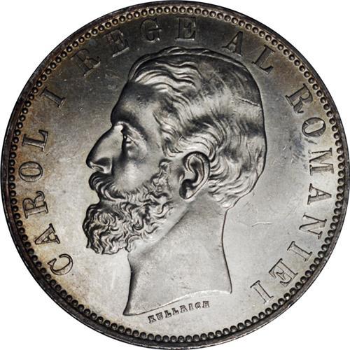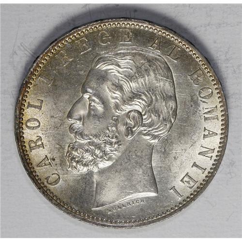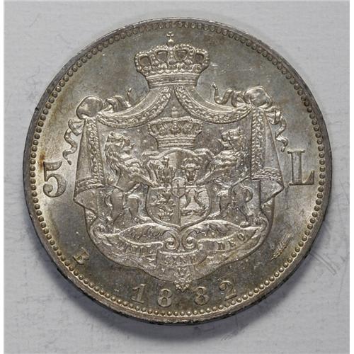 <B>Carol I 5 Lei 1882-B, </B></I>KM17.1, choice brilliant UNC with subtle golden toning emerging in the legends. The surfaces are unusually problem-free although there are some faint hairline scratches to the right of the date. Very elusive type in this appealing quality.<BR><I>From the Monedas Oro Collection</B></I><BR><BR><b>Shipping:</b> Coin/Currency (<a target="_blank" href="http://www.heritageauctions.com/common/shipping.php">view shipping information</a>) <BR><BR><B>Important
