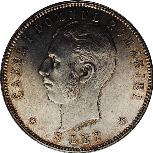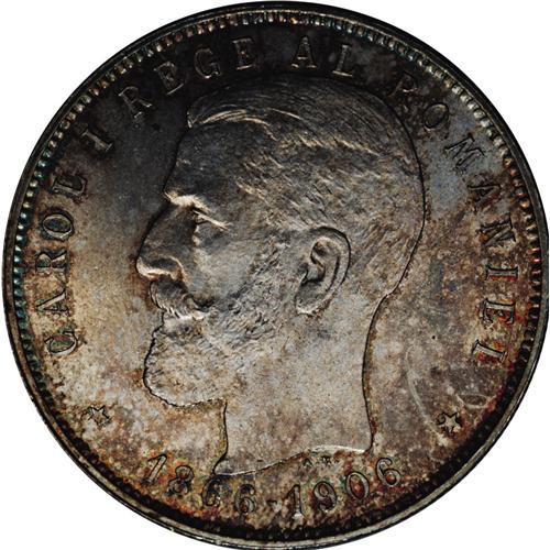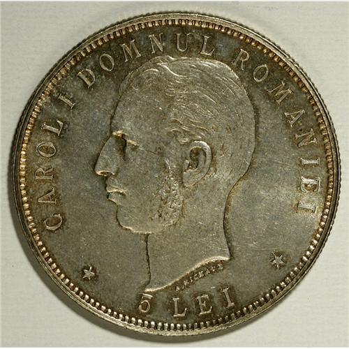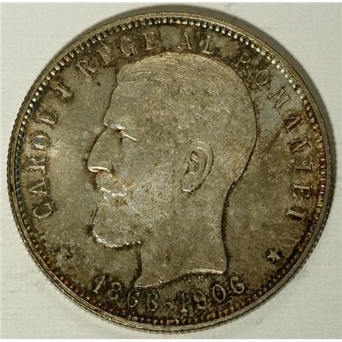 <B>Carol I 5 Lei 1906, </B></I>KM35, superb brilliant UNC with gorgeous patina, one of the nicest we have seen. The fields appear to have extremely faint hairlines, mentioned for absolute accuracy. Struck to mark the 40th anniversary of his reign.<BR><BR><b>Shipping:</b> Coin/Currency (<a target="_blank" href="http://www.heritageauctions.com/common/shipping.php">view shipping information</a>)