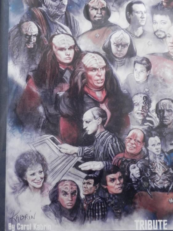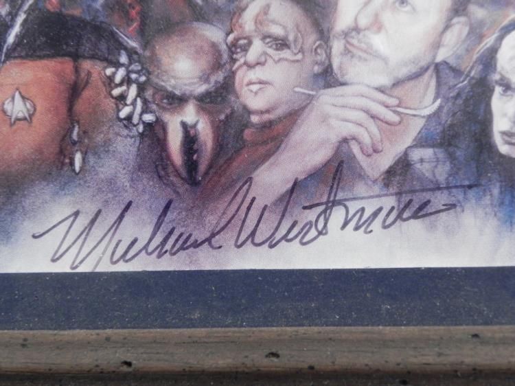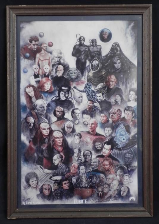 This Star Trek print is a tribute to many of the fanastic creatures and monsters in the "Next Generation" series. They appear in a collage portrait, and its exciting to see the range of unusual creations. The print is signed by the makeup artist Michael Westmore, who worked on Next, Voyager, and Deep Space Nine. Artist: Carol Kabrin Title: Tribute Signature: By Michael Westmore, in black marker, lower right Image size: 11 x 17 inches Framing: Matted in blue and framed in a wood frame Frame size: 17 x 20 inches Condition: Excellent; frame has a few nicks