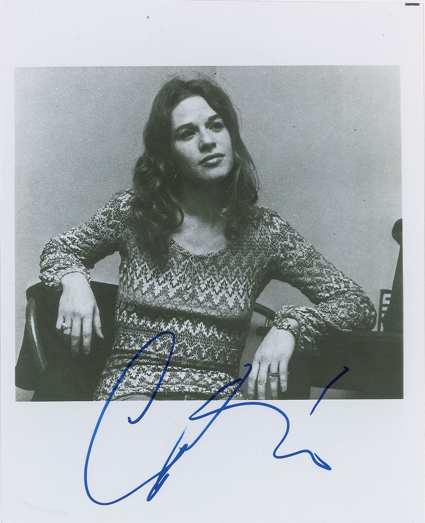 Glossy 8 x 10 half-length photo of Carole King in a casual seated pose, signed prominently in blue felt tip. In fine condition.