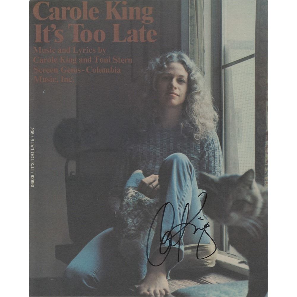 Color glossy 8 x 10 photo of the cover for the Carole King single 'It's Too Late,' signed in black felt tip. In fine condition. 'It's Too Late' was the lead single from King's landmark 1971 album Tapestry. Released in April 1971, the single reached number 1 on the Billboard Hot 100 and Adult Contemporary charts, with sales later gold-certified by the RIAA.