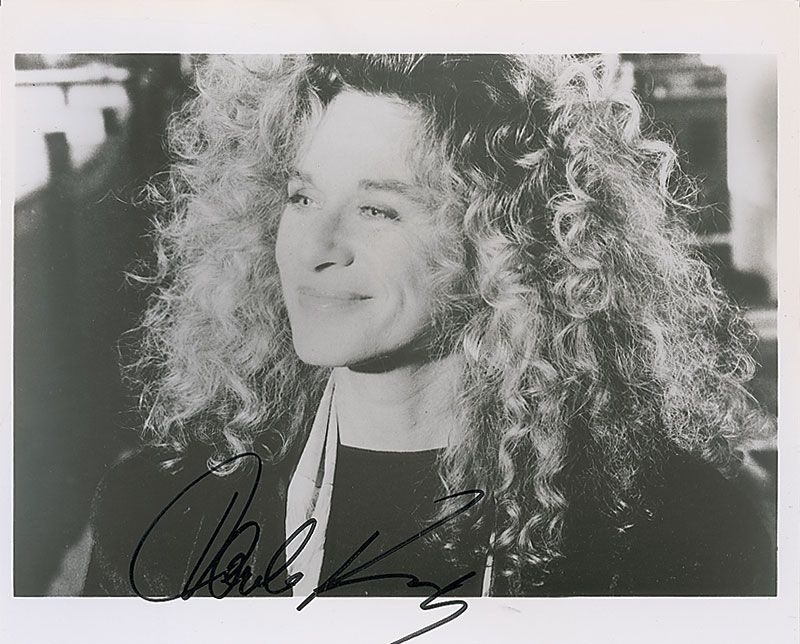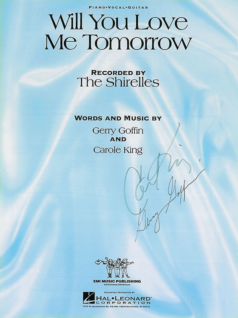 Pearl-finish 9.75 x 8 head-and-shoulders photo, signed in black felt tip; and sheet music to ‘Will You Love Me Tomorrow,’ 9 x 12, five pages, signed on the front cover in black felt tip by King and in black ballpoint by Gerry Goffin, and also signed again inside by Goffin. In fine condition.