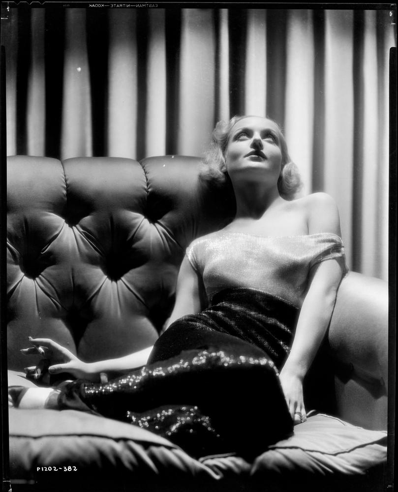 Black-and-white 8 x 10 in. camera negative on nitrate film of Carole Lombard by Eugene Robert Richee; with AFGA NITRATE FILM etched on the border, P1202-382 in India ink and retouching. Very fine; with spots at the upper left and mounting hole at the corner tips.